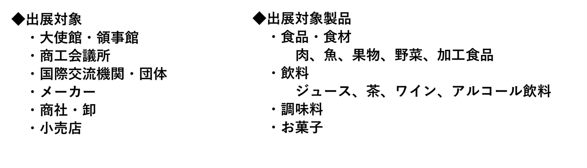 2.外国人にPR・販売をしたい製品をお持ちの方 (海外販路開拓の場としてもご活用いただけます) 食品(名産品、農産物・畜産物・果物、スイーツ・銘菓) 飲料 酒 雑貨 化粧品
