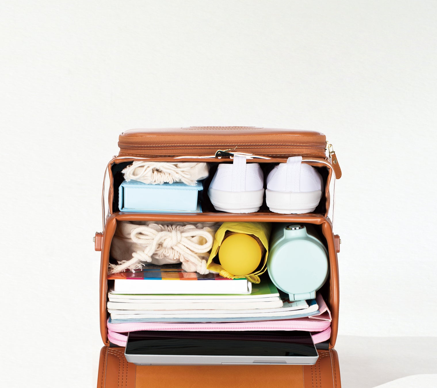 教科書・ノート類に加え、タブレット端末や水筒なども収納できる大容量モデルに仕上げました。A4フラットファイルやタブレット端末にも対応できるマチ幅12.5㎝で、荷物が多いときは、最大5㎝伸