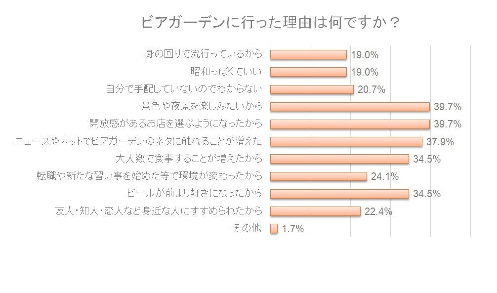 ビアガーデンの利用が増えている理由としては、開放感があるお店を選ぶようになった39.7%、大人数で食事をすることがふえたから34.5%等の世の中の変化に伴う理由に加え、ニュースやネットでビアガーデンのネタに触れることが増えたから37.9%、身近な人に勧められたから22.4%、身の回りで流行っているから19%等、ムーブメントに乗る形式で利用されている方も一定数いました。