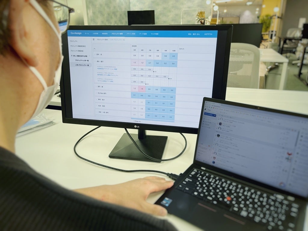 ペタビットでは、毎朝課長クラスでアサイン会議を行い、プロジェクトごとの人材配置の調整を行っています。導入前は、各メンバーの実工数は稼働後の報告から見えていたものの、次の予定として何が埋まっているかが把握できていなかったため、アサイン会議の場で出たリクエストに応えられる状況か、別途各メンバーや上長に確認・調整する工数が発生していました。現在は、500以上のプロジェクトが登録される中でも、日々Co-Assignに登録される各メンバーのアサイン状況を見ながら話し合うことで、会議内での調整完結に成功しています。