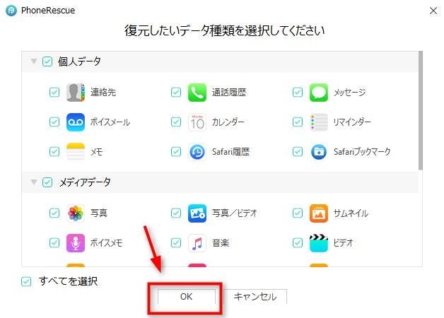 Step2:復元したいデータのカテゴリを選択し、「OK」をクリックします。