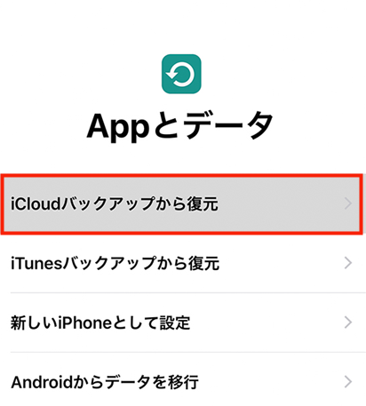 Step2:「Appとデータ」画面が表示されるまで指示に従い、「iCloudバックアップから復元」をタップします。