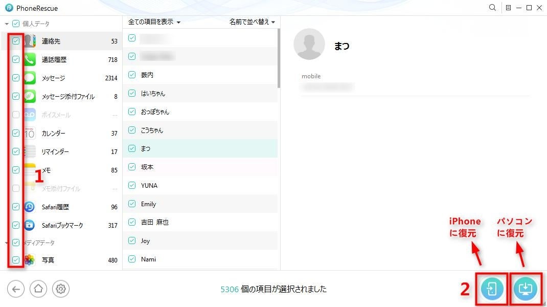 Step3:復元したいデータを選択し、「iPhoneに復元」ボタンまたは「パソコンに復元」アイコンをクリックします。復元が完了するまで、少しお待ち下さい。