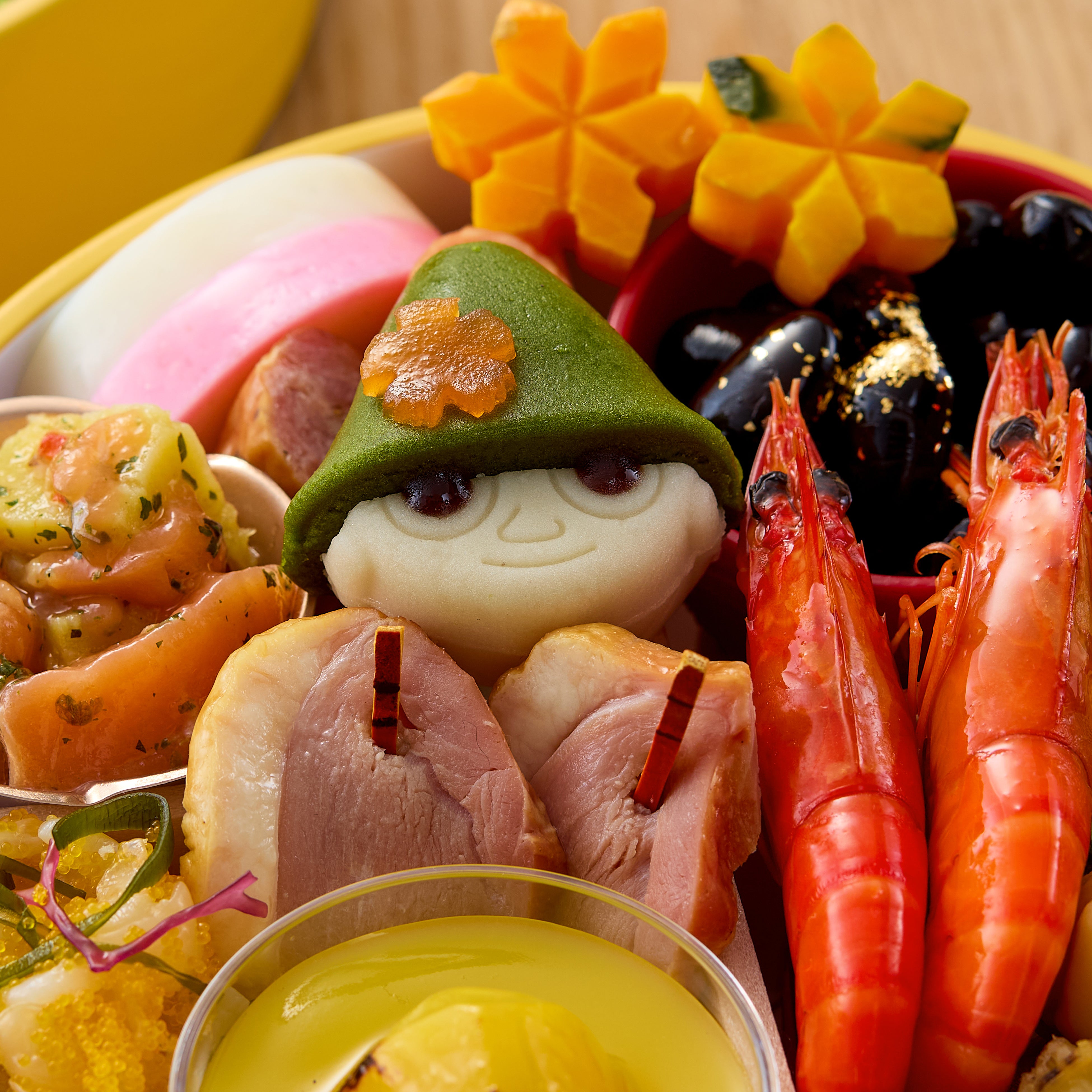 昨年は発売から約2週間足らずで完売したムーミンのおせちですが、今年はムーミンたちと明るい黄色を基調とした花の絵柄をデザインした愛らしい重箱に、大人向けの洋風食材を盛り込みました。リトルミイとスナフキンの練り切りやローストビーフ、合鴨スモーク、サーモンバジルなどの食材が、食卓を華やかに彩ります。蒸すだけで簡単にできる具沢山の茶碗蒸しと、オリジナルデザインの風呂敷、祝い箸を一緒にお届けします。まるでムーミンたちがお祝いに駆けつけてくれたような気分になれる、おしゃれなおせちセットです。