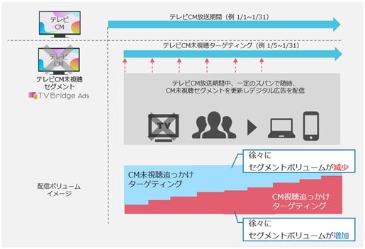 従来、提供しておりました「TVBridge Ads」の「CM視聴追っかけターゲティング」では、テレビCM放送期間中に短いスパンで定期更新される「テレビCM視聴」セグメントを生成し、平行してデジタル広告を配信してきました。この度、この「テレビCM視聴」セグメントに加え、広告主から多数ご要望を頂いておりました、「テレビCM未視聴」セグメントを新たに追加し、テレビCM放送期間中に、テレビCMを視聴していないユーザーへのターゲティング配信を可能とする機能アップデートをリリースいたしました。