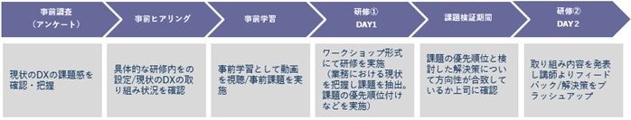 市町村職員へDX推進に必要な業務上の課題を発見・改善における基礎的な知識の習得を目的に、事前の課題ヒアリングから課題の抽出、優先順位付け、解決策の検討に対して講師からのフィードバックまでを約2か月間で実施します。