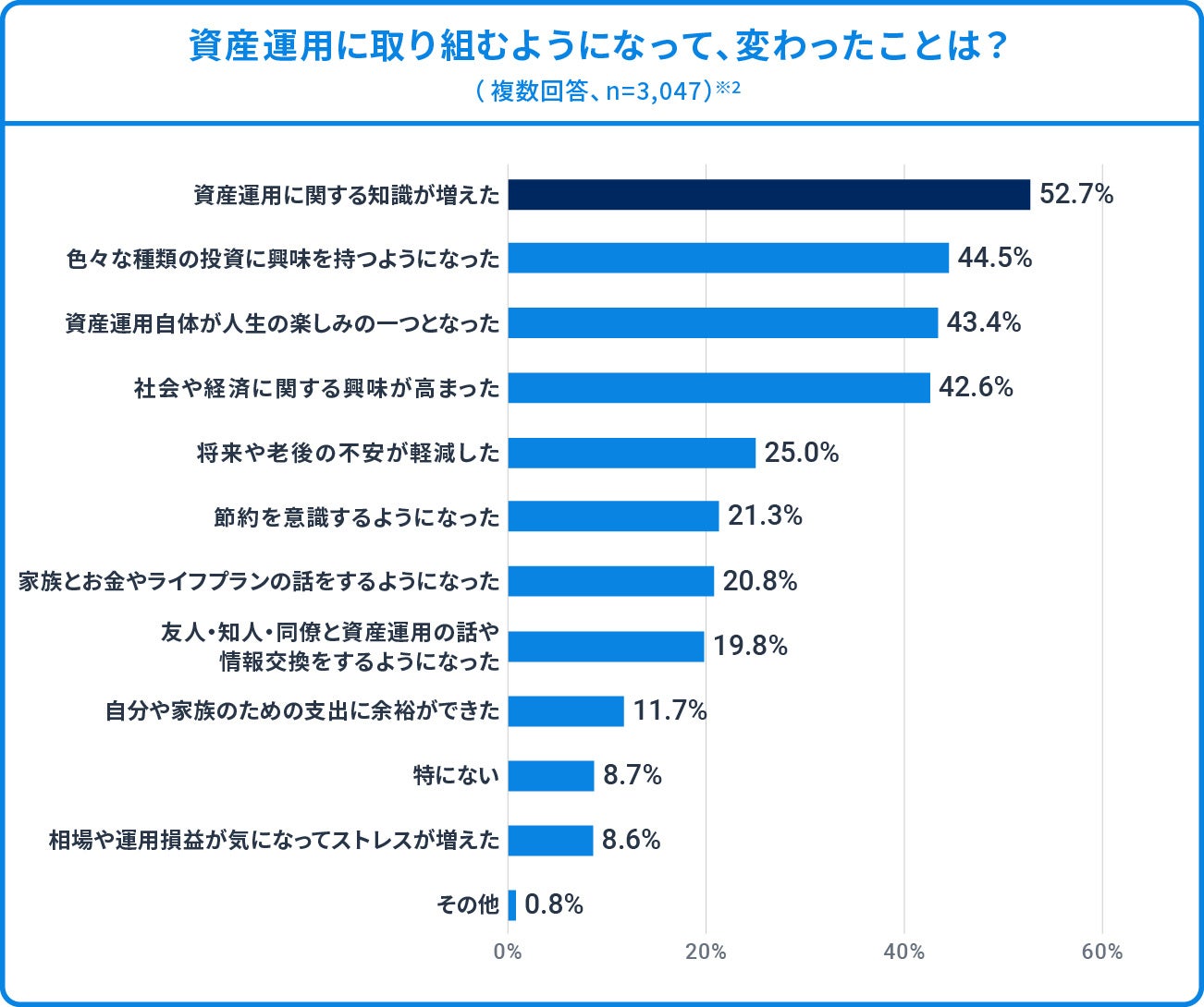 ※2 「資産運用に取り組むようになって変わったことがありましたら教えてください。(いくつでも)」への回答(複数回答、回答者数:3,047人、小数点第2位を四捨五入)