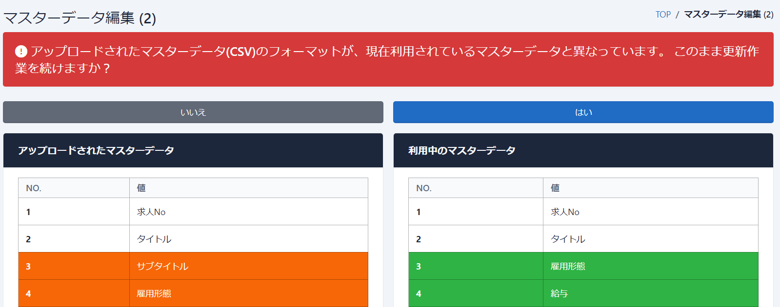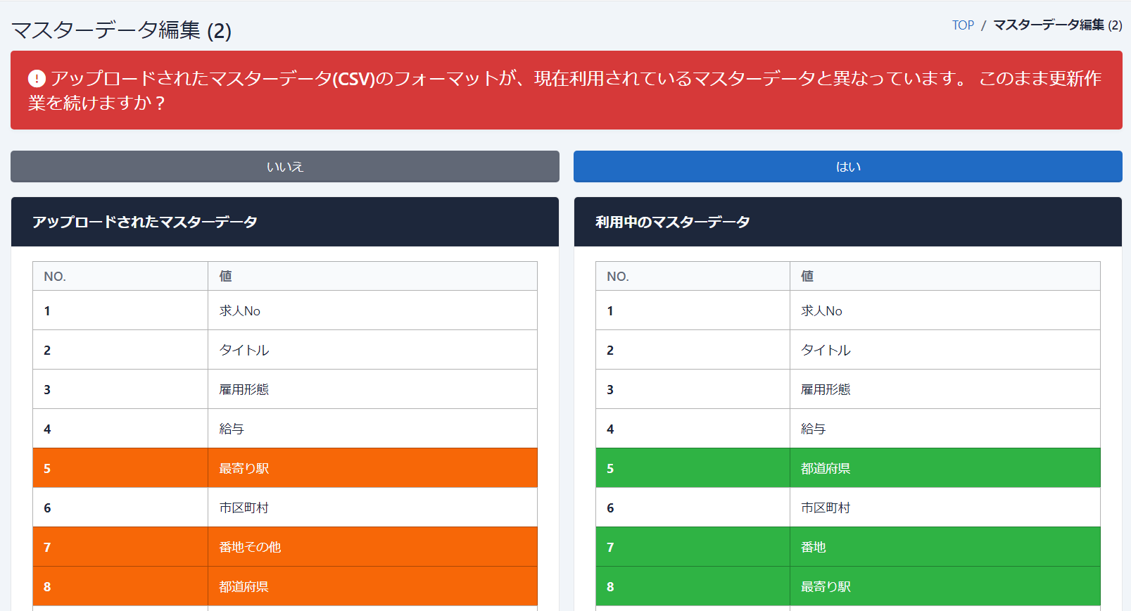 既に取り込んでいる求人マスターデータと新たに取り込むデータのカラム内容、並び順を比較し差異があれば