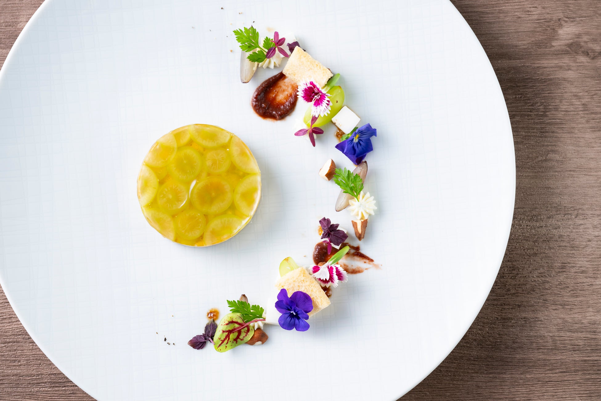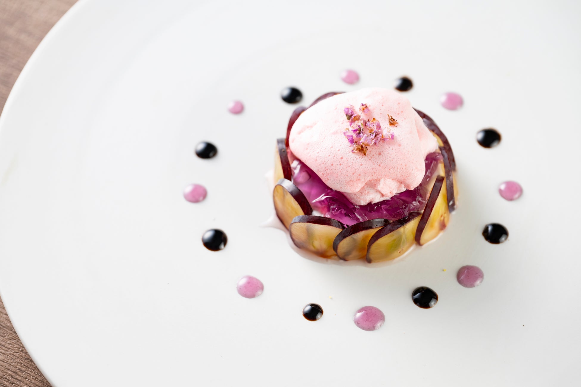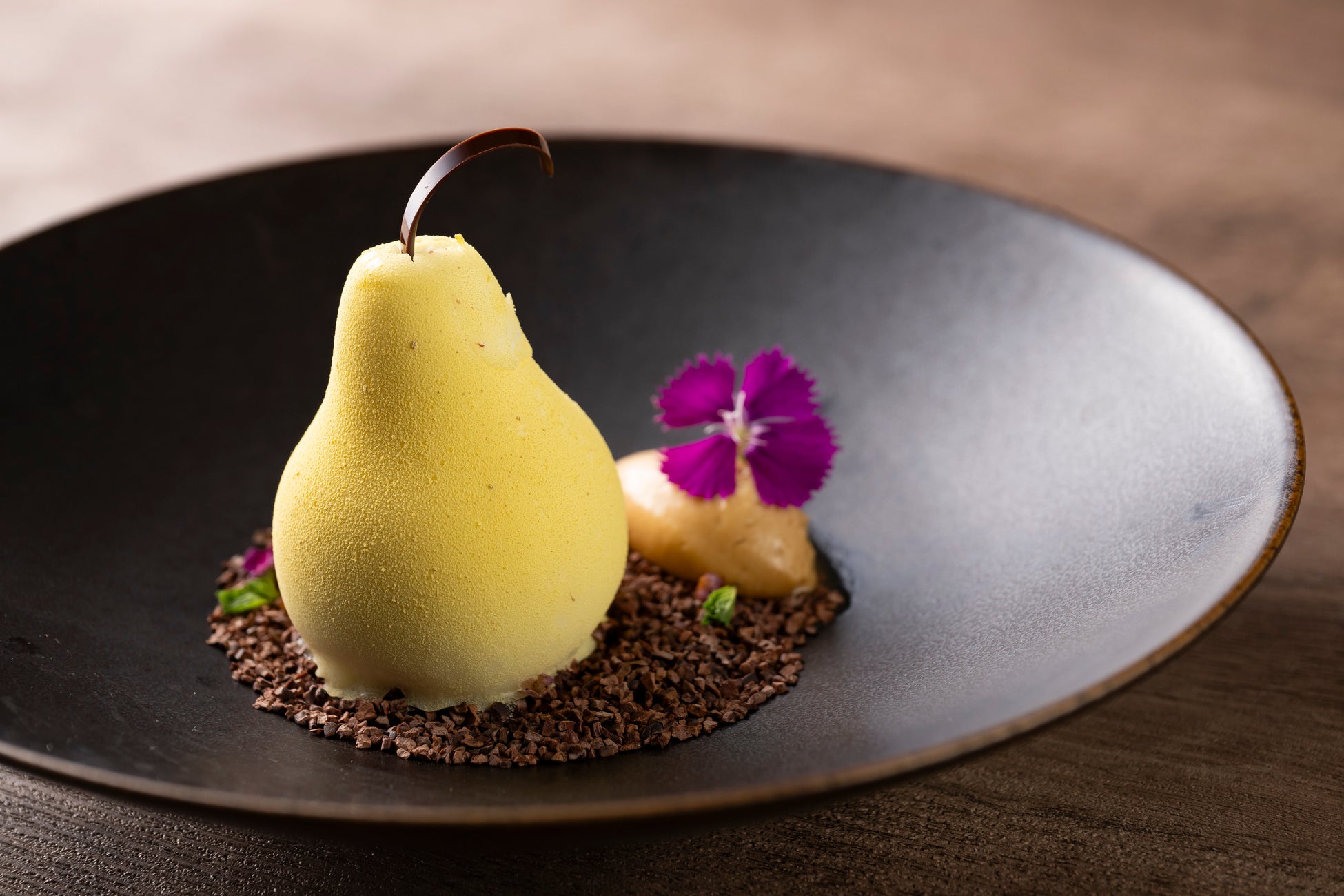 2種から選べるグランデセールは、ル・レクチェのムースをホワイトチョコでコーティングし、ル・レクチェの果肉入りゼリーを詰め、見た目もル レクチエをオマージュ。キャロブクッキーの食感やキャラメルとトリュフ塩のアイスクリームとともに味の変化をお楽しみいただけます。また、マスカルポーネムース、ぶどうのジュレで構成されているぶどうのシャルロットは、アーモンドソルベ、バルサミコソース、ざくろの風味を纏った泡とともにご堪能いただけます。