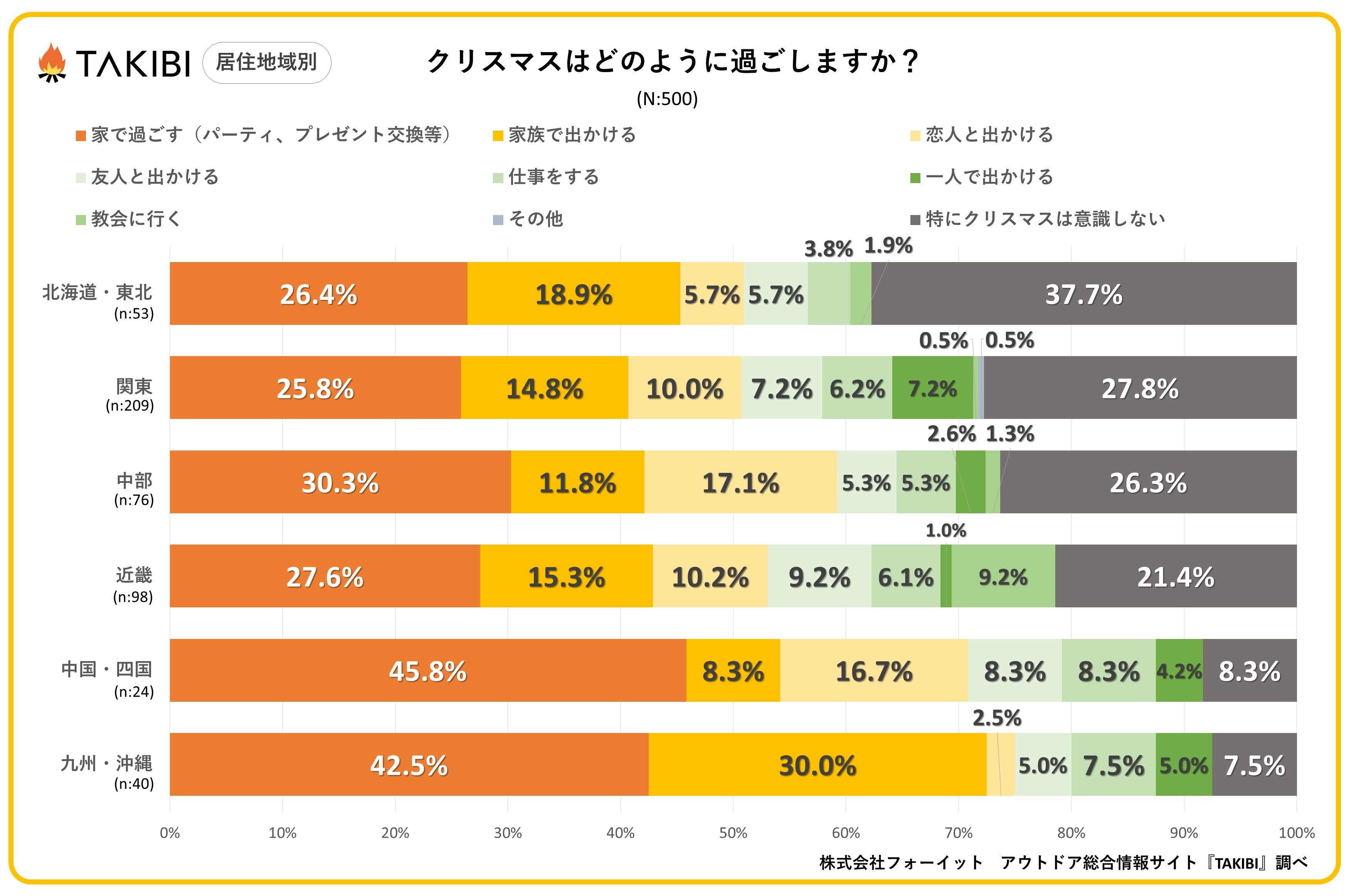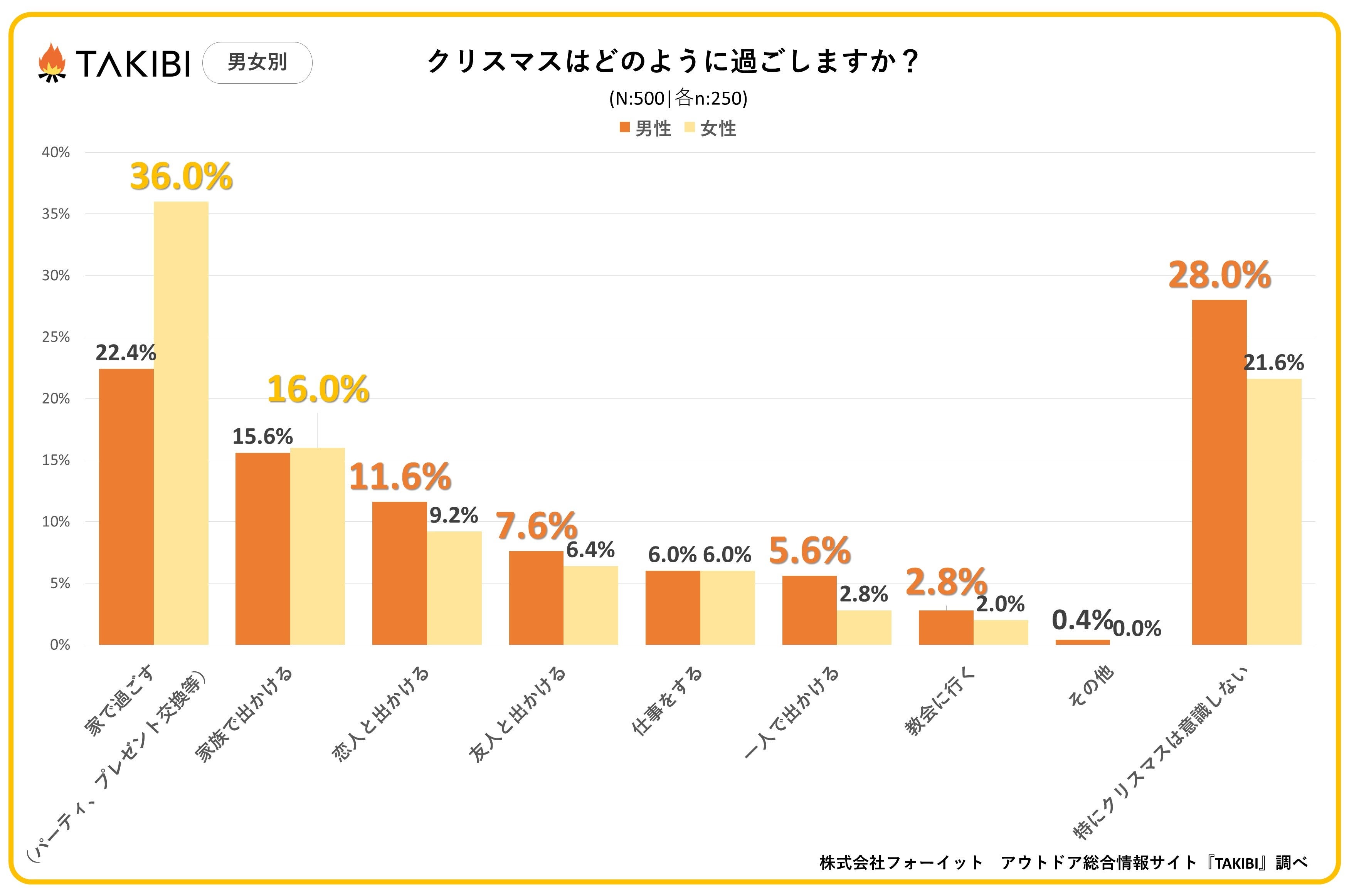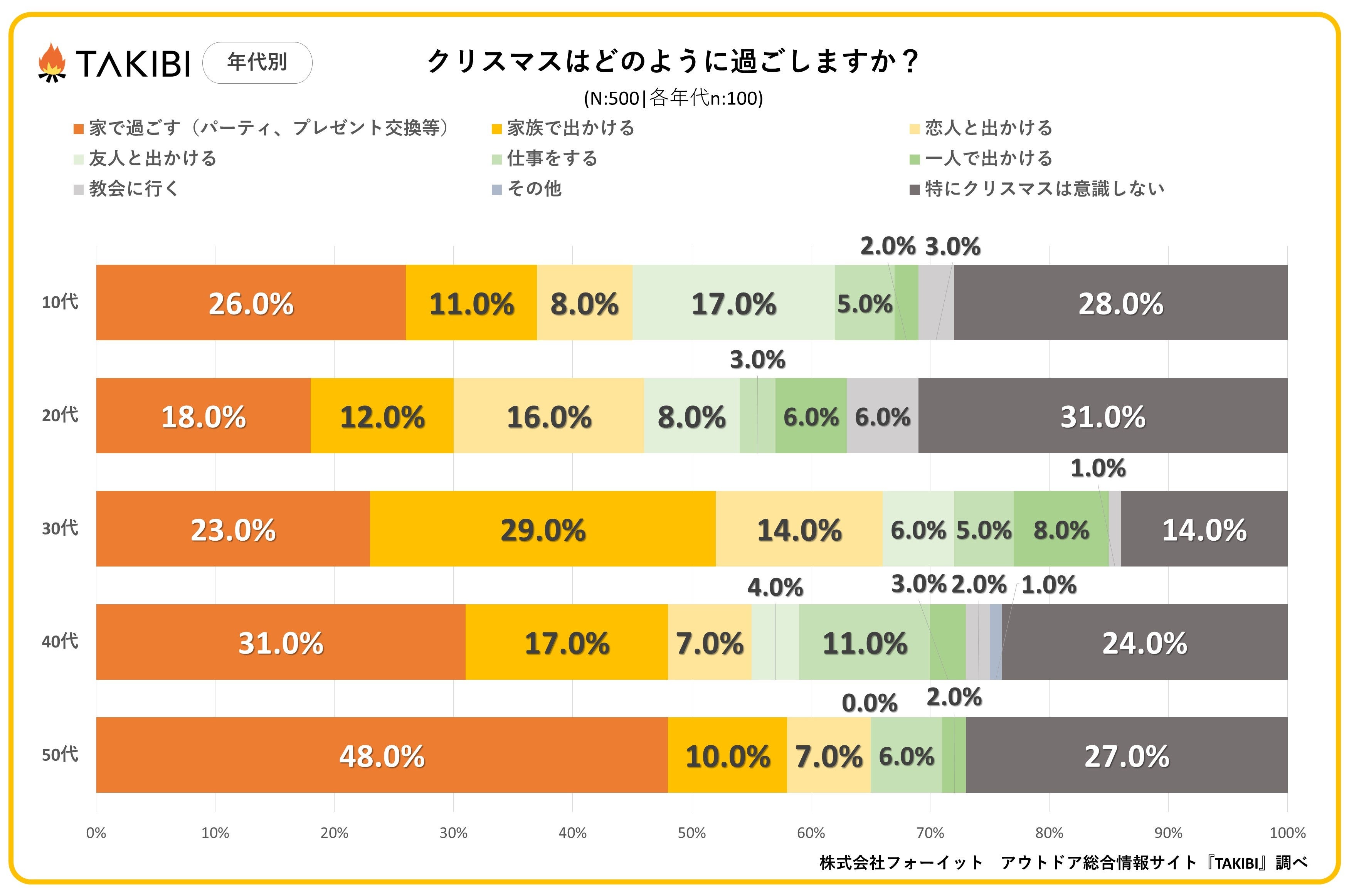 キャンプやグランピングを中心としたアウトドア総合情報サイト「TAKIBI」の運営をおこなう株式会社フォーイットは、全国の10代~50代までの男女500人を対象にクリスマスに関するアンケートを実施し、男女別・年代別等の特徴についてまとめました。