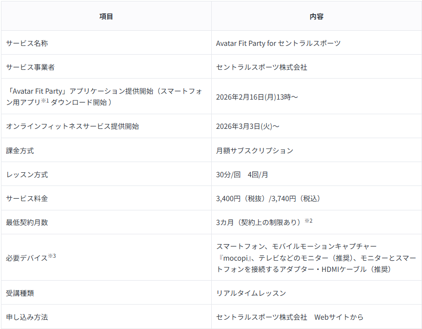 ※3 必要なデバイスは利用者側で用意する必要があります。オンラインフィットネスサービス「Avatar Fit Party (AFP) for セントラルスポーツ」の詳細はセントラルスポーツ株式会社のWebサイトをご確認ください