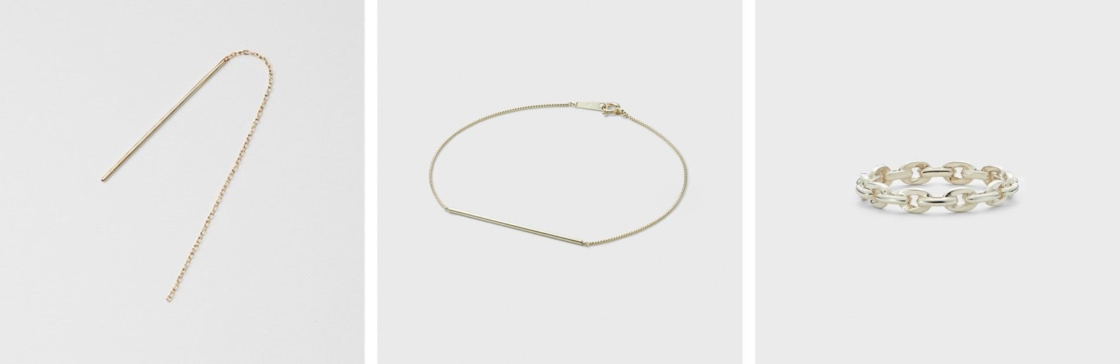 ストレートに佇むバーが印象的なピアスやブレスレットは、シンプルながら唯一無二の存在感を与えるシーンレスなデザイン。ぐるりと一周デザインが施されたチェーンリングは、立体的なボリューム感であなただけのアクセントを指元に光らせます。