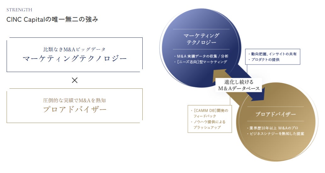 CINCは2014年の創業時よりテクノロジーを強みとしたマーケティング支援を提供しています。ビッグデータ解析をもとにした再現性あるマーケティング手法による集客と、テクノロジーを用いた効率的な営業活動によって自社の事業を成長させ、そのノウハウをソリューション開発やコンサルティングサービスに落とし込み、顧客を支援してきました。この特徴を新たな事業分野に応用すべく、2023年11月にM&A仲介事業を開始しました。