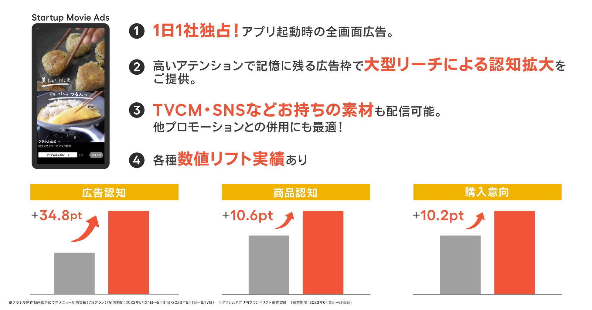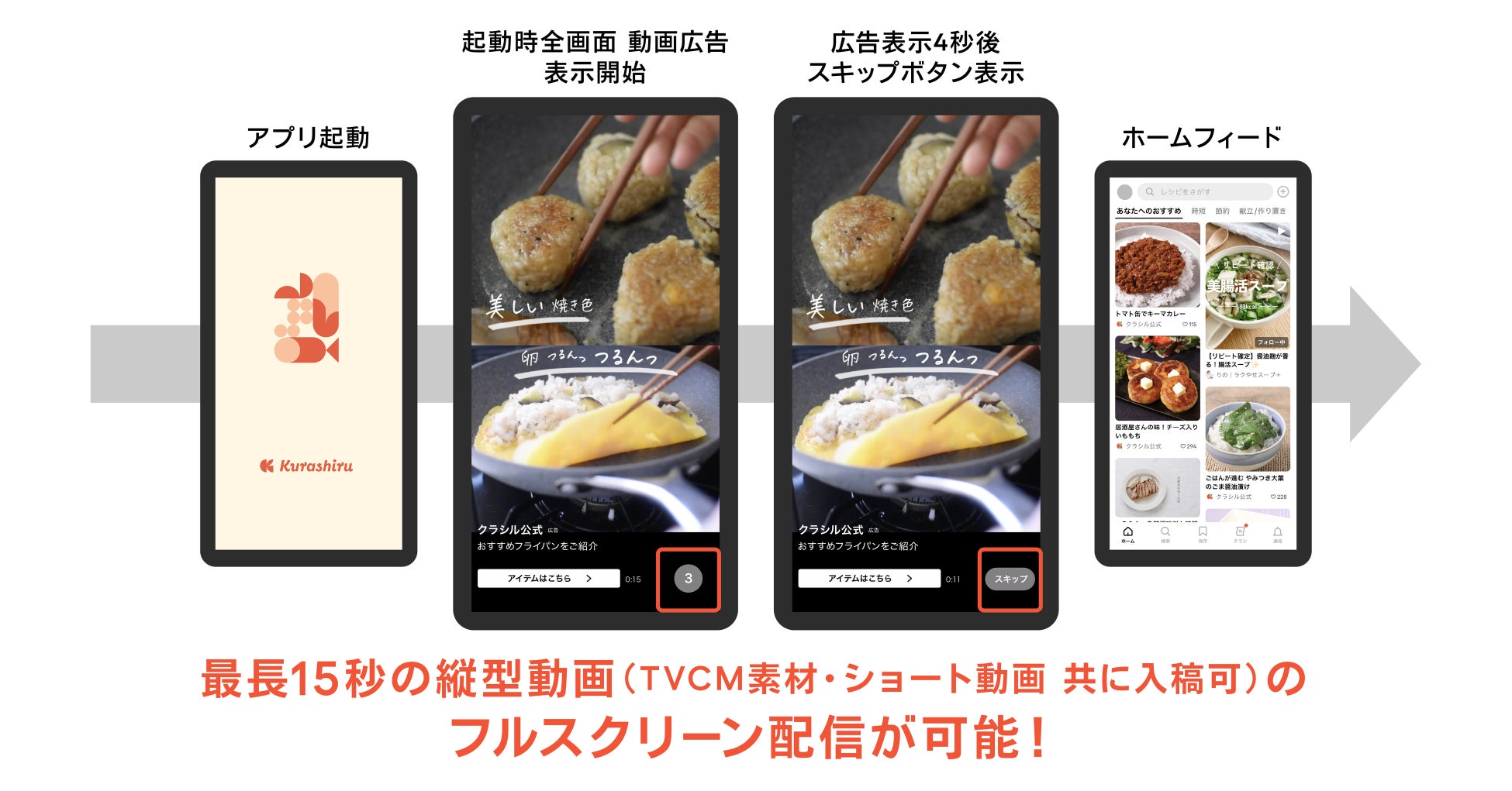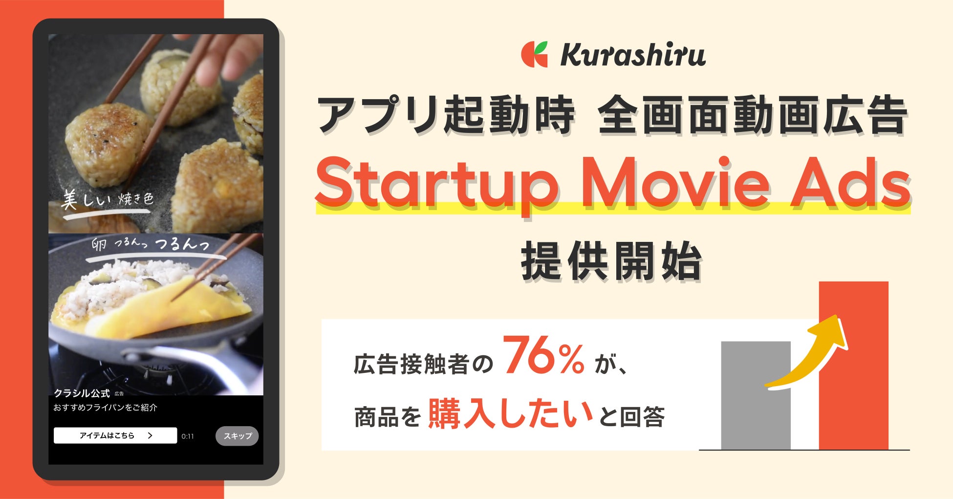 【アプリ起動時に全面表示】国内No.1のレシピプラットフォーム「クラシル」がフルスクリーン動画広告 「Startup Movie Ads」の提供を開始