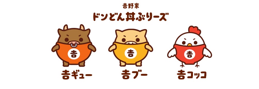 吉野家の公式キャラクターを務める「ドンどん丼ぶりーズ」は、どんどん食べてほしいという想いから名付けました。吉ギュー、吉ブー、吉コッコそれぞれのプロフィールを紹介します。