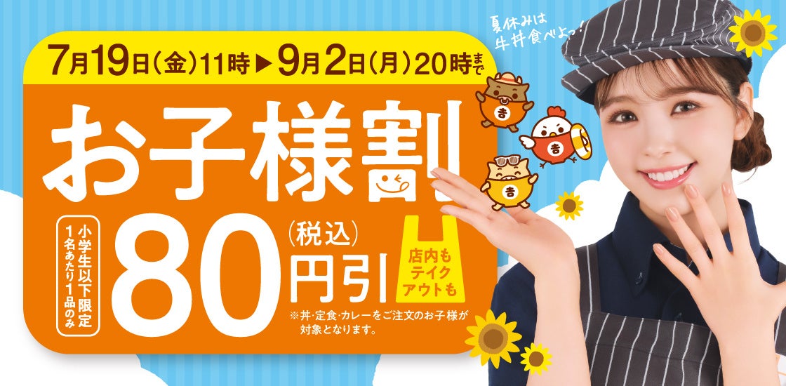 株式会社吉野家(本社:東京都中央区、代表取締役社長:河村泰貴)は、夏休み期間中にあたる7月19日(金)11時から9月2日(月)20時までの期間、全国の吉野家店舗※で小学生以下のお子様の食事を80円(税込)引きする『お子様割』を実施します。期間中は利用回数の制限はありません。対象商品は「牛丼」をはじめ、丼・皿・カレー・定食メニュー60種類以上あります。 ※一部店舗では実施していません。