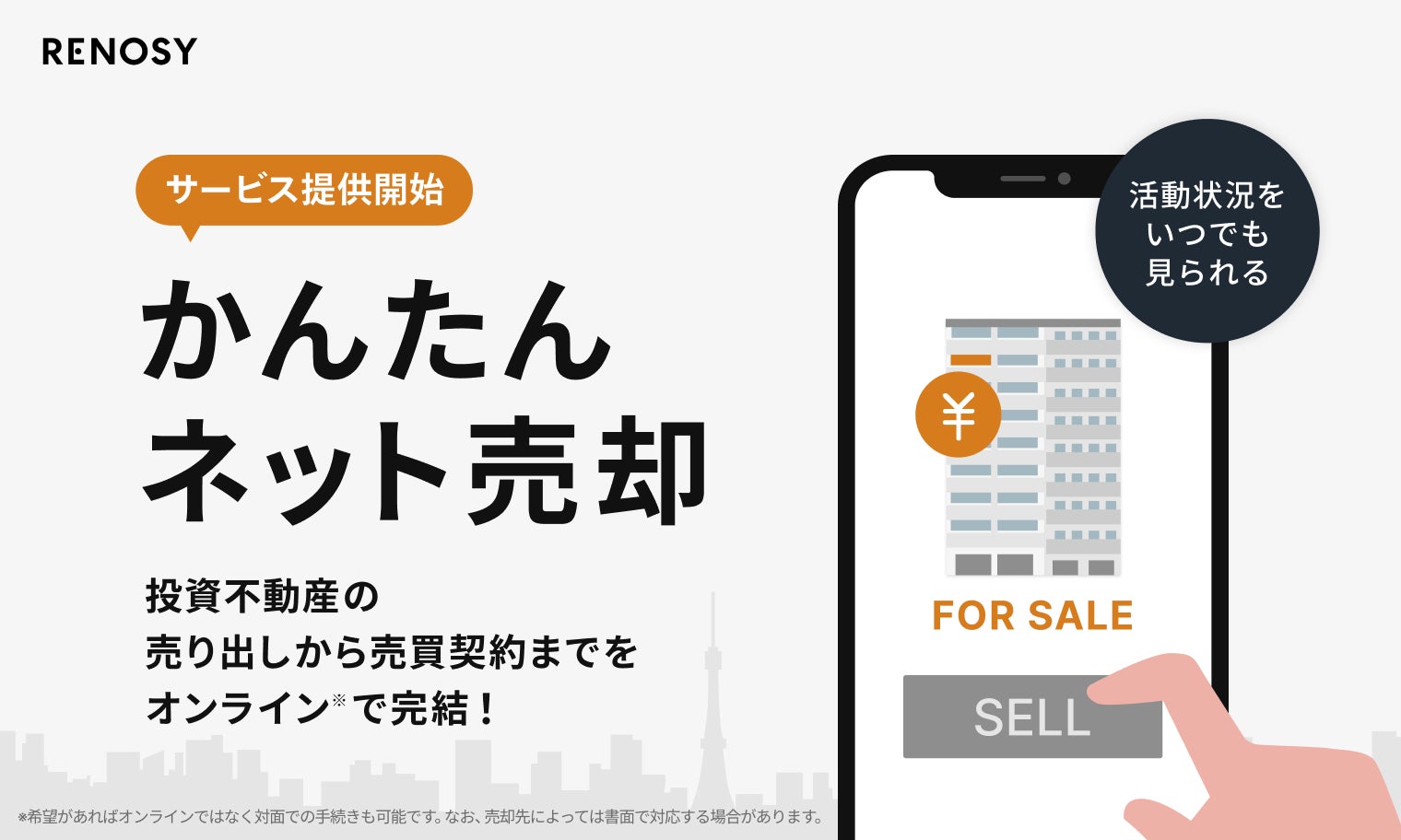 株式会社GA technologies[GAテクノロジーズ](本社:東京都港区、代表取締役 社⻑執⾏役員 CEO:樋⼝ ⿓、証券コード:3491、以下「当社」)が運営するネット不動産投資サービスブランド「RENOSY (リノシー)」は、投資用不動産オーナーが所有する物件の売却がネット上(※1)で完結する「かんたんネット売却」を本格開始しました。