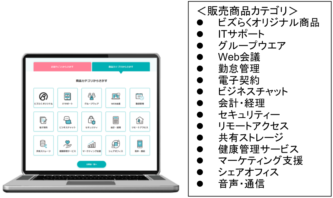 「ビズらく」では使いやすく便利なSaaS・通信商品およびサービスを厳選し、紹介・販売します。事業の開始時には、「Web会議」や「電子契約」などの商品カテゴリから32種類の商品をラインアップします。また、ラインアップの中には、手頃な価格帯のオリジナル商品も含まれています。商品は、「ビズらく」のウェブサイト上の「お困りごとから探す」「商品カテゴリから探す」の2種類のメニューから選ぶことができ、お客さまの状況に合わせた検索が可能です。取扱商品は、お客さまのニーズを踏まえて、順次拡大する予定です。