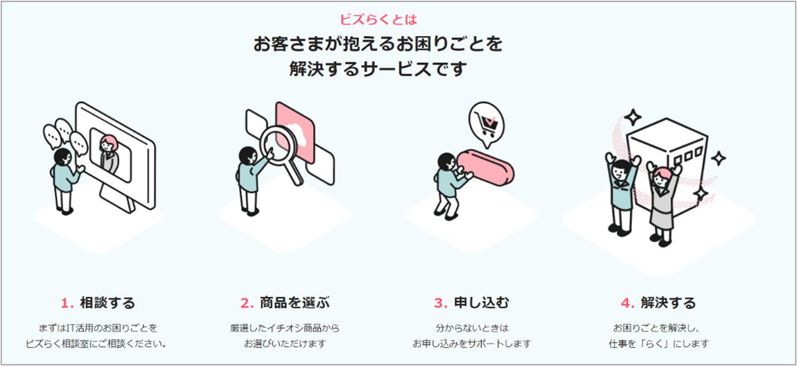 また、ITツールの購入先を選定する際に重視する点としては、「導入サポートサービスやアフターサービスがあること」「相談や質問をしやすい」が上位項目を占めていました。このような状況から「ビスらく」では、導入前にはお困りごとの相談を受けてニーズに合った課題解決商品を提案し、実際にSaaS・通信商品を触って試せるプロセスを経て、導入後には運用支援までを含めたワンストップサービスを提供することで独自の価値を提供できると捉え、一貫してお客さまに“寄り添う”ことができる仕組みを構築しました。■「ビズらく」の概要
