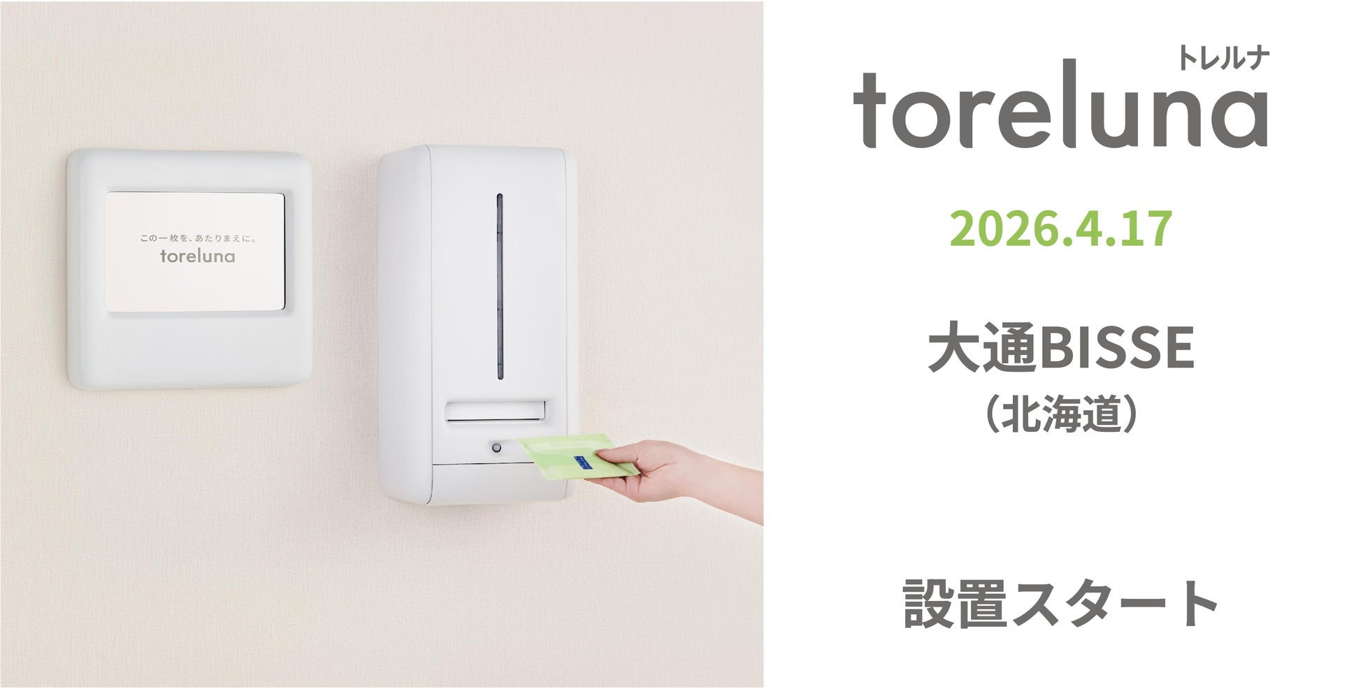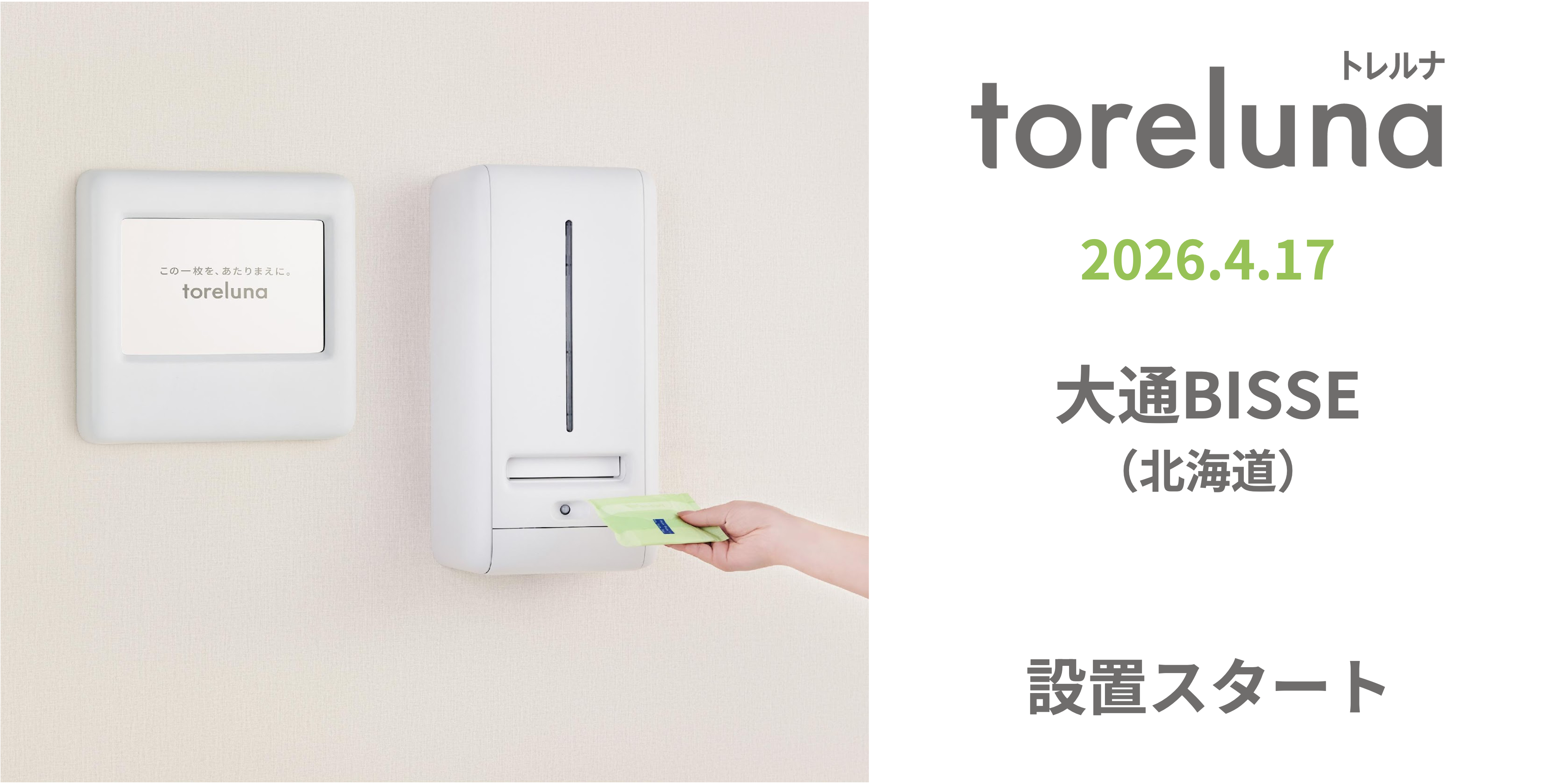 株式会社ネクイノ(大阪市北区、代表取締役:石井 健一)は、トイレの個室で生理用ナプキンを常備し無料で提供するサービス「toreluna(トレルナ)」(以下 トレルナ)を、大通BISSEへ設置し、サービスの提供を開始いたします。