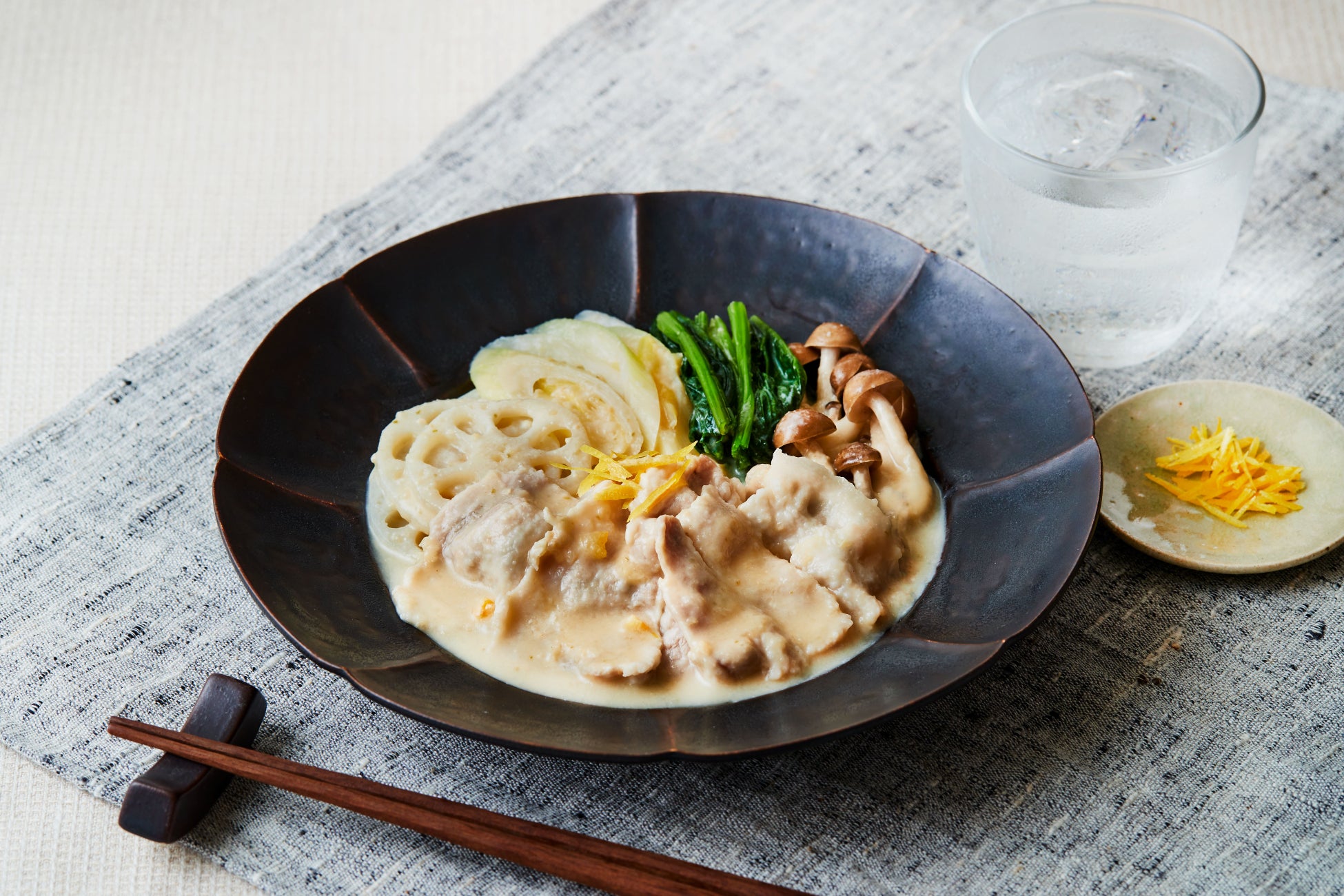 落花生をたっぷり入れた芳醇な煎りごまソースで和えた季節野菜と豚肉の贅沢な一品です。