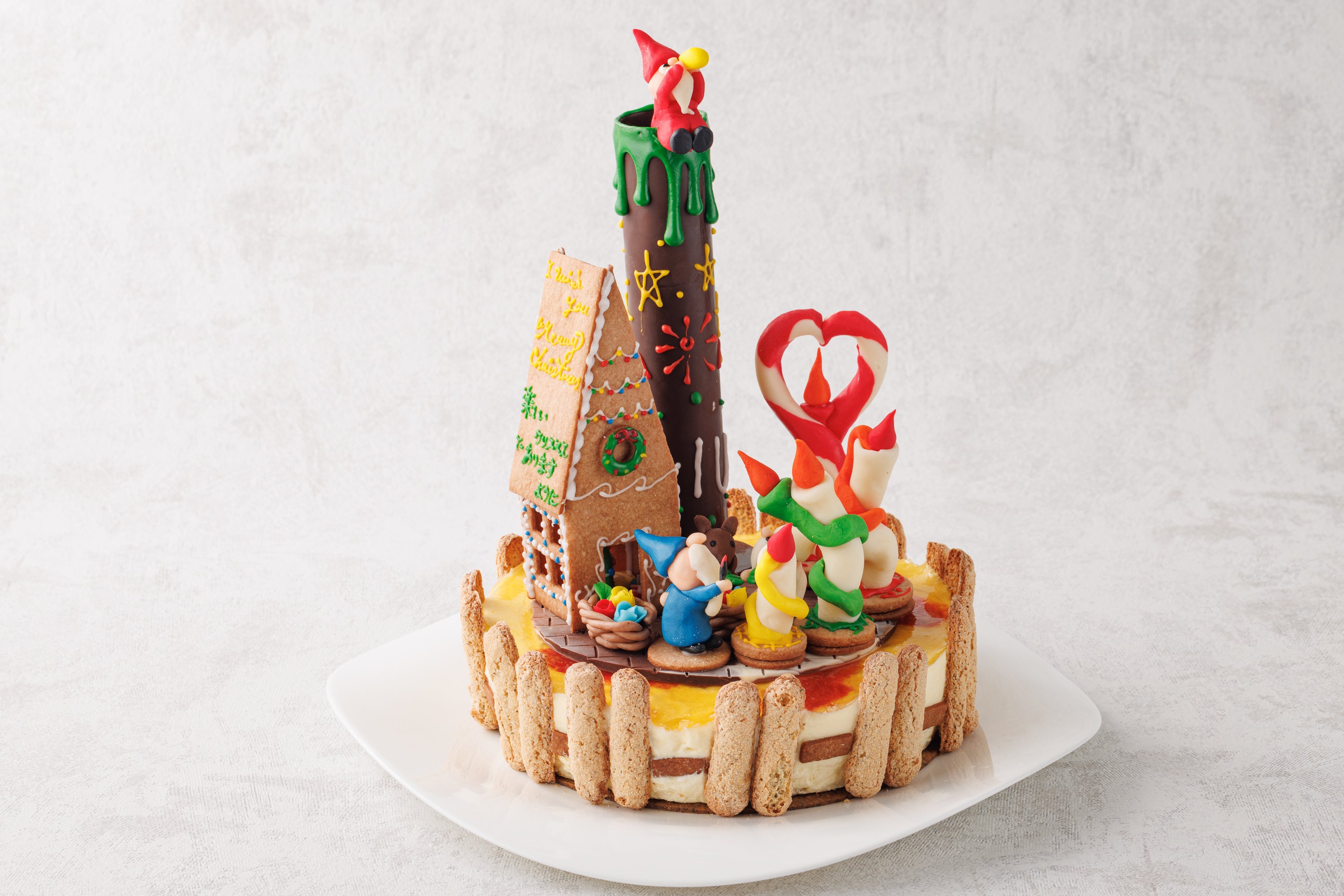スポンジ生地にパッチックムース、イチゴのソース、イチゴのムースをのせてイチゴやチョコレート、紅茶のラングドシャなどでデコレーションしました。
