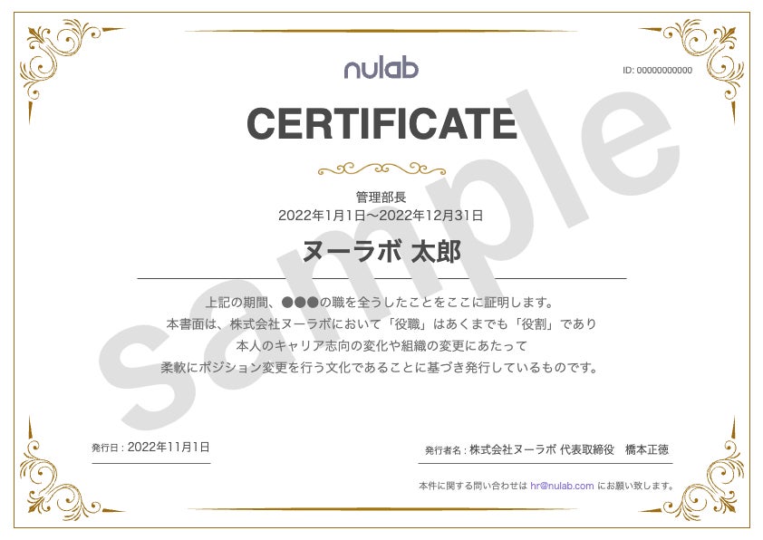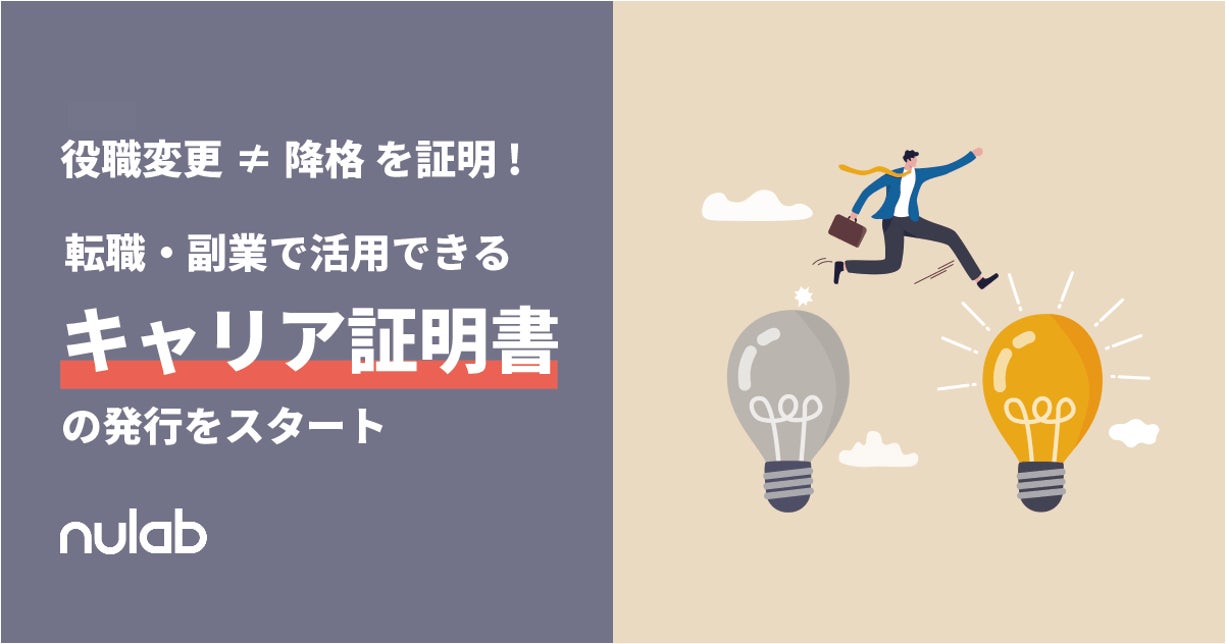 ヌーラボは、これからも個人のキャリア志向や異動の希望をより柔軟に受け入れられる体制構築に努め、「役職」にとらわれない風土を醸成したいと考えています。一方で、このような役職から前向きに外れるケースが一般的ではなく、社外の方からは「降格」のように見える可能性があることも理解しています。ヌーラボ特有の人材ポリシーにより、従業員が新しいキャリアを踏み出す際、役職変更の履歴がキャリアに不利に働くことがないよう、降格ではない旨を証明する目的で「証明書」を発行します。