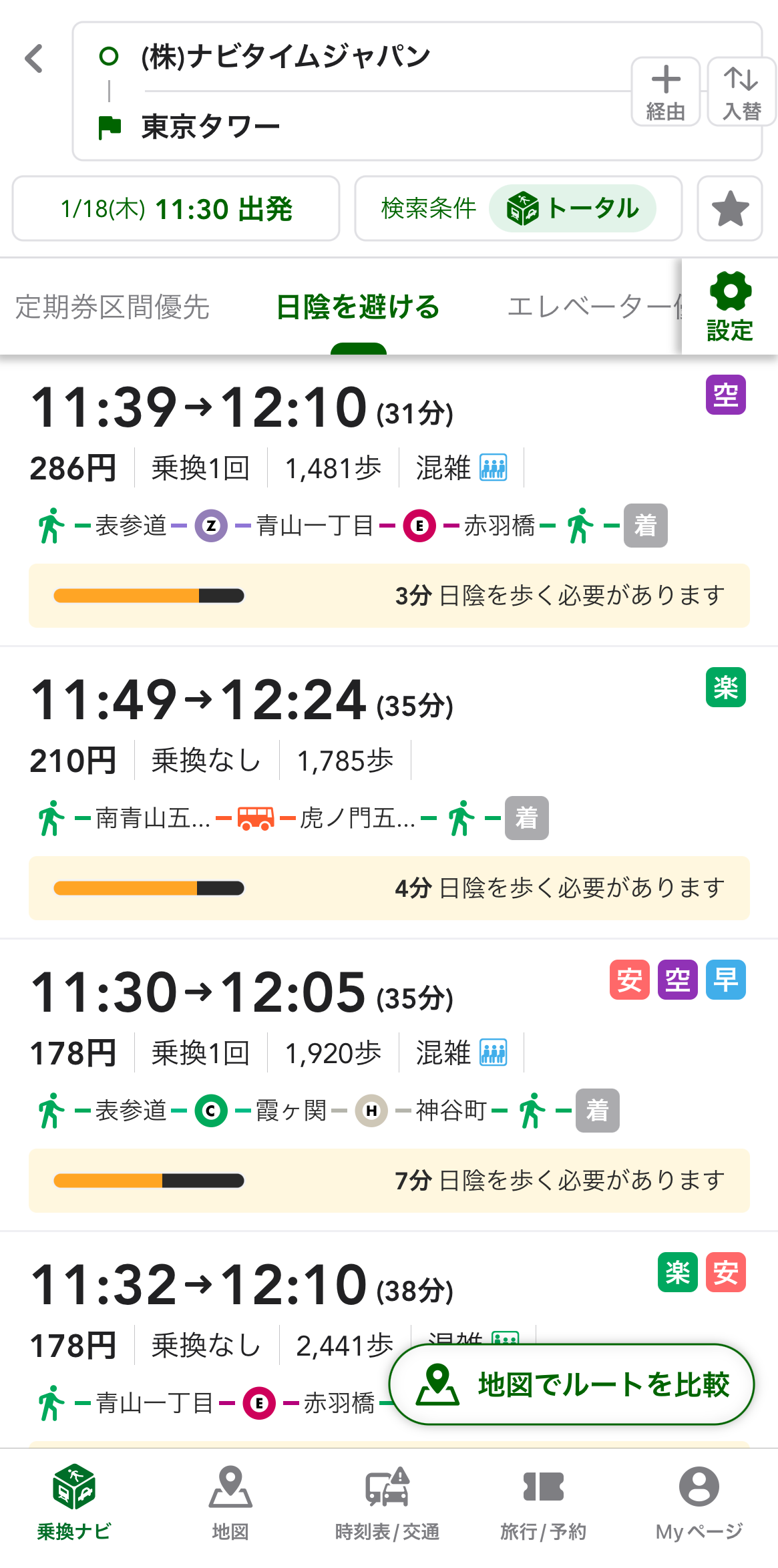 『NAVITIME』では、「乗換ナビ」タブを開いて、出発地/目的地設定後、検索を行います。ルート一覧画面右側にある「設定」ボタンを押すことでルートバリエーション設定一覧が開き、その中に「日陰を避けるルート」が表示され、選択することで設定できます。「3分日陰を多く歩く必要があります」といった文言が表示されます。本機能は年間を通じて提供します。