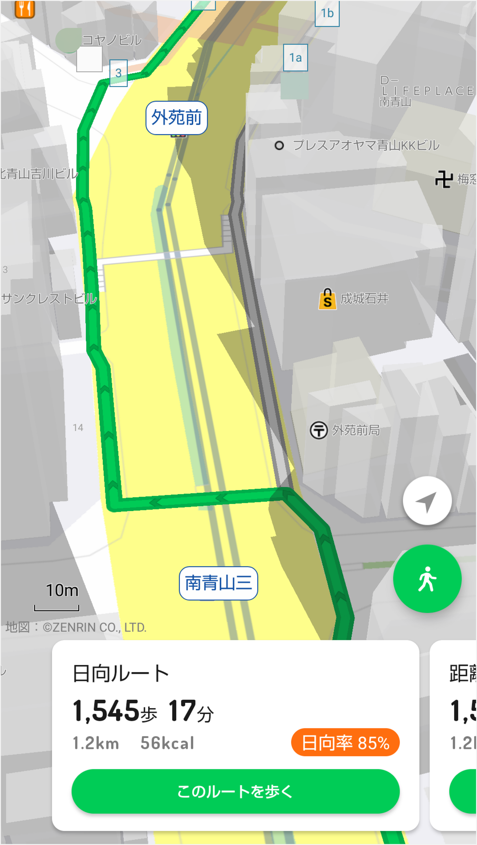 今回は、「日陰ルート」で培った技術を活かし、"日向"を優先して通るルートを開発しました。日中は建物の影がほとんど発生せず日向ルートの候補が非常に多くなります。一方で、朝方・夕方は日陰ルートが多くなります。そのまま反転してしまうと、特にルート候補の多い日中において、実用性の低いルート候補がたくさん出てしまうことが検証段階で明らかになったため、日陰ルートの技術をそのまま活用するのではなく、日向の特性にあったチューニングを行うことで、利用者に違和感のないルート提示が可能となりました。