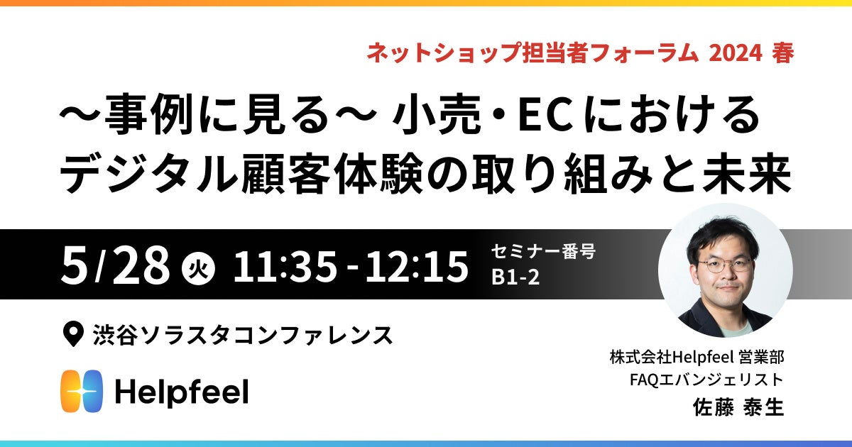 株式会社Helpfeel(京都府京都市、代表取締役/CEO:洛西 一周、以下「当社」)は、2024年5月28日(火)〜5月29日(水)に開催されるEC事業者向けイベント「ネットショップ担当者フォーラム 2024 春」にて、当社のFAQエバンジェリスト 佐藤がセミナーに登壇することをお知らせいたします。