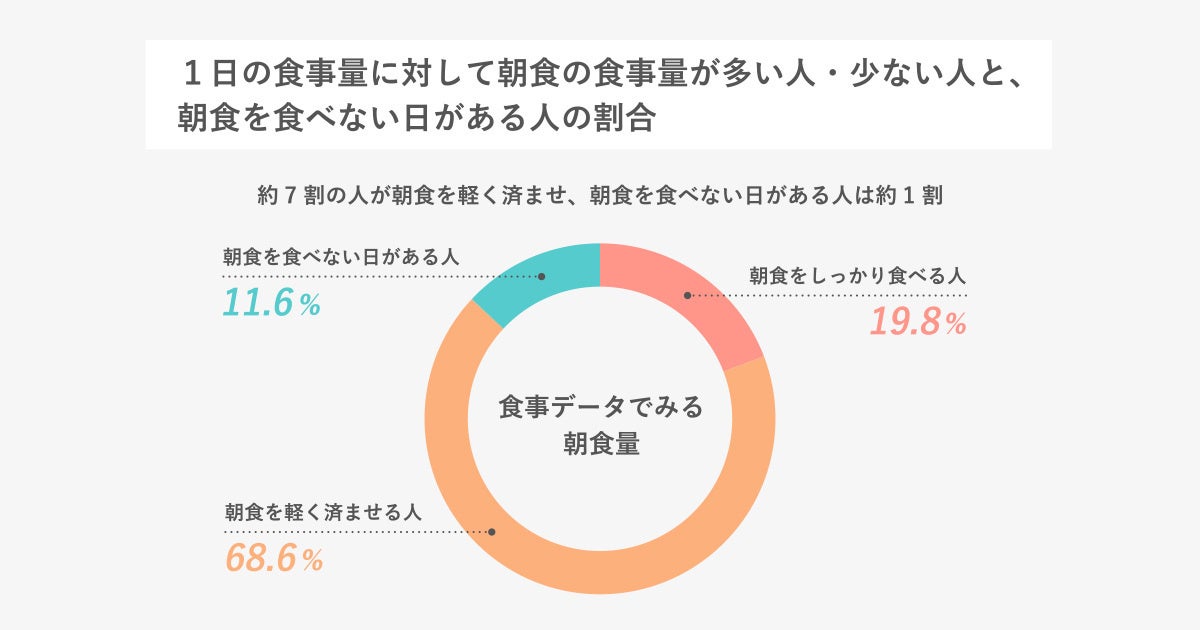 まずは、FiNCアプリに登録された食事記録から、朝食の食事量について調査しました。朝食を食べない日がある人とともに集計すると、朝食を軽く済ませる人は68.6%と最も多く、朝食を食べない日がある人は11.6%でした。朝食をしっかり食べる人は少数派のようです。