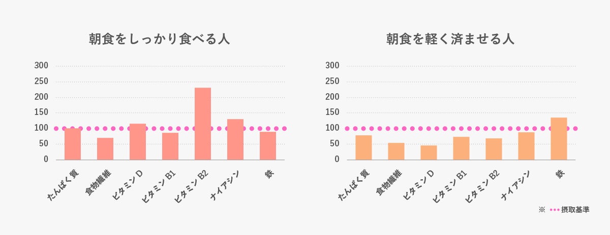 ※「朝食をしっかり食べる人」を朝食摂取エネルギーが1日総摂取エネルギーの1/3以上の人、「朝食を軽く済ませる人」を朝食摂取エネルギーが1日総摂取エネルギーの1/3未満の人と定義。「日本人の食事摂取基準(2020年版)」の目標量、推奨量または目安量の1/3量を基準値として使用。基準値:食物繊維は目標量、たんぱく質、ビタミンB1、ビタミンB2、ナイアシン、鉄は推奨量、ビタミンDは目安量を使用。