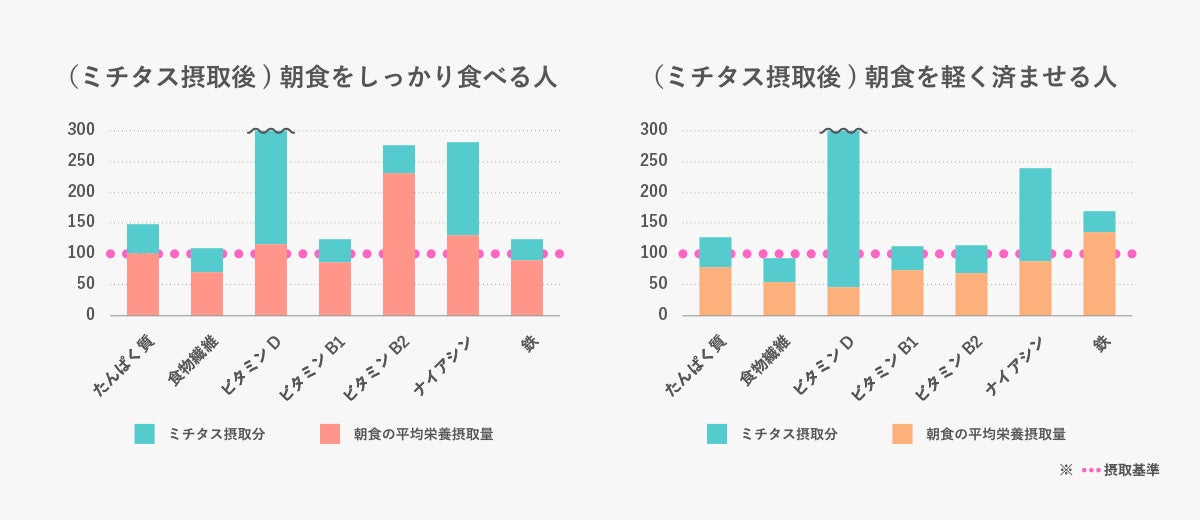 ※「朝食をしっかり食べる人」を朝食摂取エネルギーが1日総摂取エネルギーの1/3以上の人、「朝食を軽く済ませる人」を朝食摂取エネルギーが1日総摂取エネルギーの1/3未満の人と定義。「日本人の食事摂取基準(2020年版)」の目標量、推奨量または目安量の1/3量を基準値として使用。基準値:食物繊維は目標量、たんぱく質、ビタミンB1、ビタミンB2、ナイアシン、鉄は推奨量、ビタミンDは目安量を使用。各ユーザーにミチタス1本加えシミュレーション。