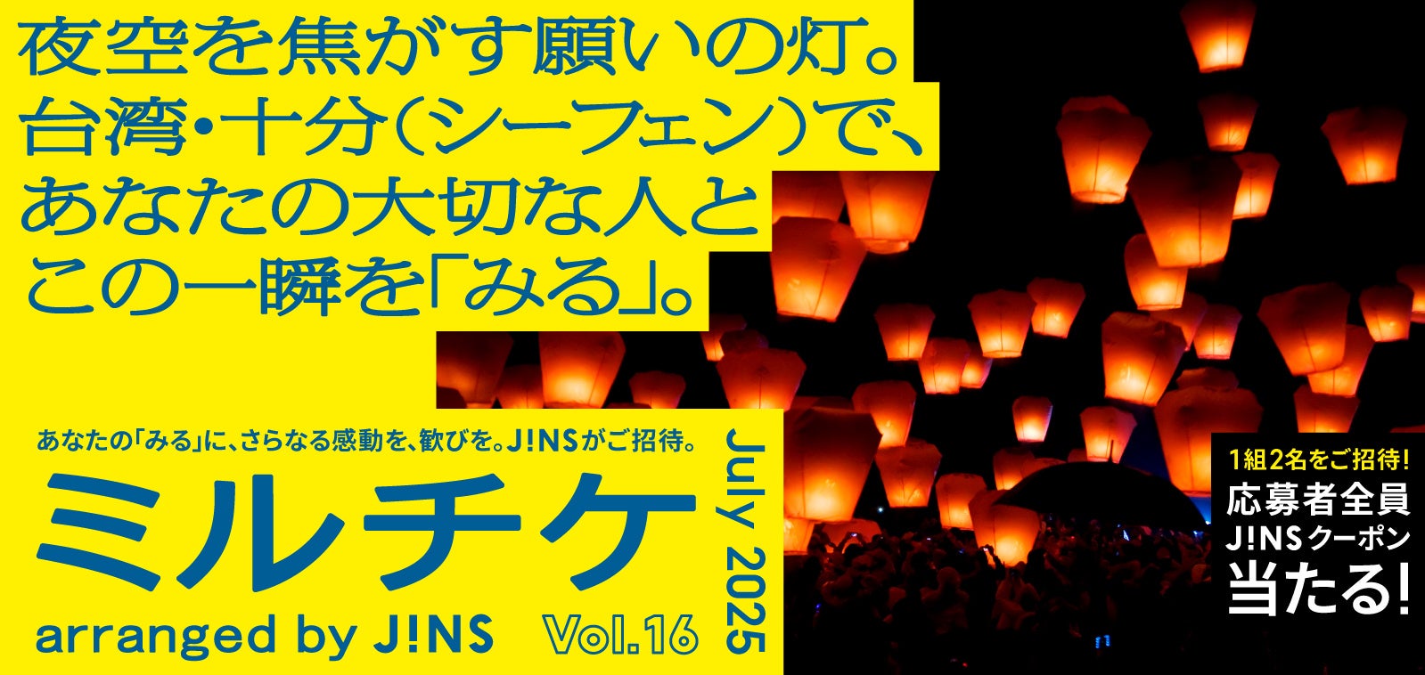 株式会社ジンズ(以下JINS)は、日常では体験できない特別な「みる(見る・観る・視る)」をチケットにして毎月抽選でご招待する「ミルチケ」(https://www.jins.com/jp/campaign/miruticket/)のVol.16として、台湾の十分(シーフェン)で、夜空を焦がす願いの灯を大切な人と共に「みる」体験への応募受付を、2025年7月1日(火)より開始します。