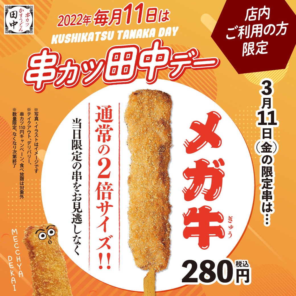 株式会社串カツ田中ホールディングス(本社:東京都品川区東五反田、代表取締役社長:貫 啓二、以下:串カツ田中)は、より一層お客様に楽しんでいただくため、2022年1月より毎月11日を「串カツ田中デー」として、毎月限定の串カツを販売しております。 「串」の形に見立てた毎月11日の単日限定で、店内利用のお客様のみを対象とした特別串となっております(テイクアウト専門店を除く)。 3月11日(金)は、圧倒的な人気を誇り、不動の定番である『串カツ牛』が2倍のサイズとなった「メガ牛」を販売いたします。1本で2本分のボリュームでありながら、20円お得な価格となっております。お肉好きのお客様はもちろん、通常の串カツ牛と比べた写真を撮るなどSNSでも楽しむことが出来、幅広い層のお客様にお楽しみいただけることを期待しております。