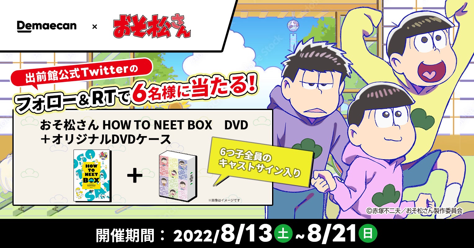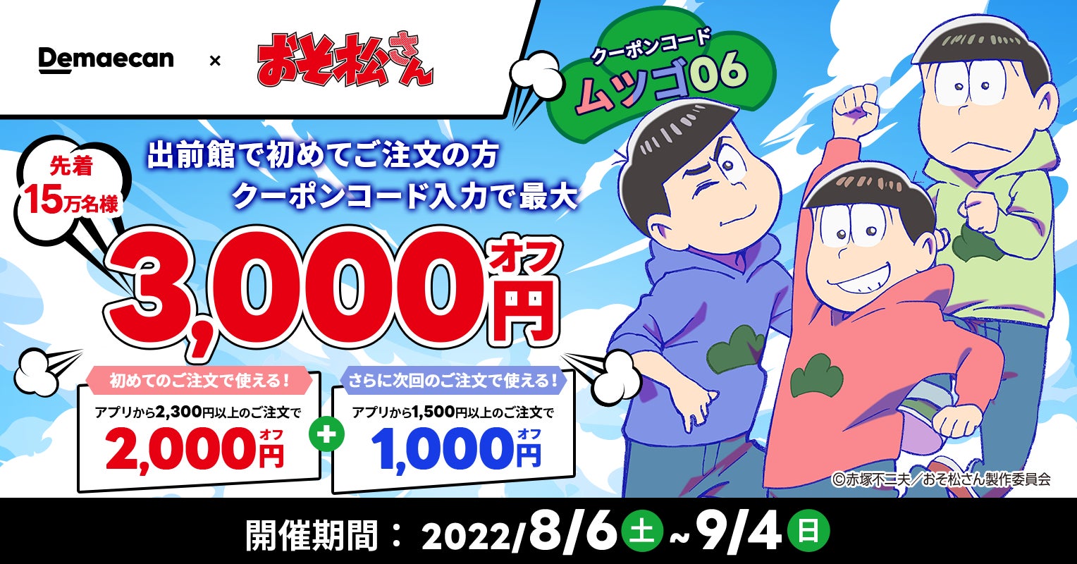 日本最大級のデリバリーサービス『出前館』(運営:株式会社出前館)は、赤塚不二夫の名作ギャグ漫画「おそ松くん」を原作とした大人気TVアニメ「おそ松さん」と2022年8月6日(土)よりコラボキャンペーンを開催いたします。