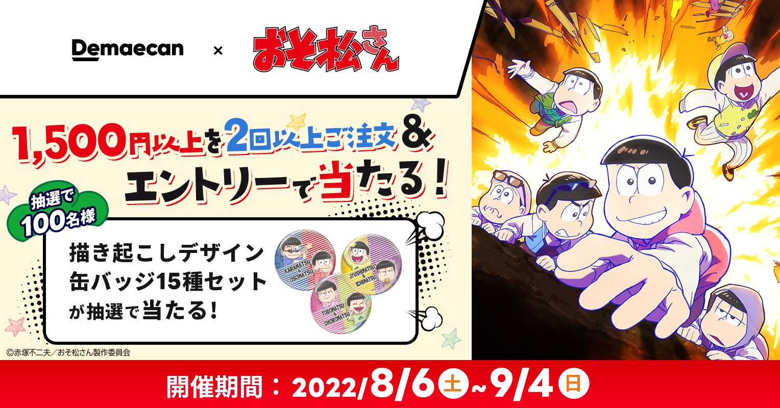 このたび『出前館』は、「おそ松さん」とのコラボキャンペーンを2022年8月6日(土)より開催します。本キャンペーンにご参加いただいた方の中から抽選で、「描き起こしデザイン缶バッジ15種セット」をプレゼントいたします。同日に『出前館』をお得にご利用いただけるコラボクーポンも配布いたします。また、『出前館』の公式Twitterにて、フォロー&RTキャンペーンを2022年8月13日(土)より開催いたします。さらに、「おそ松さん」とコラボしたLINEスタンプを2022年8月9日(火)より無料配信いたします。『出前館』LINE公式アカウントを友だち追加するとダウンロードいただけます。