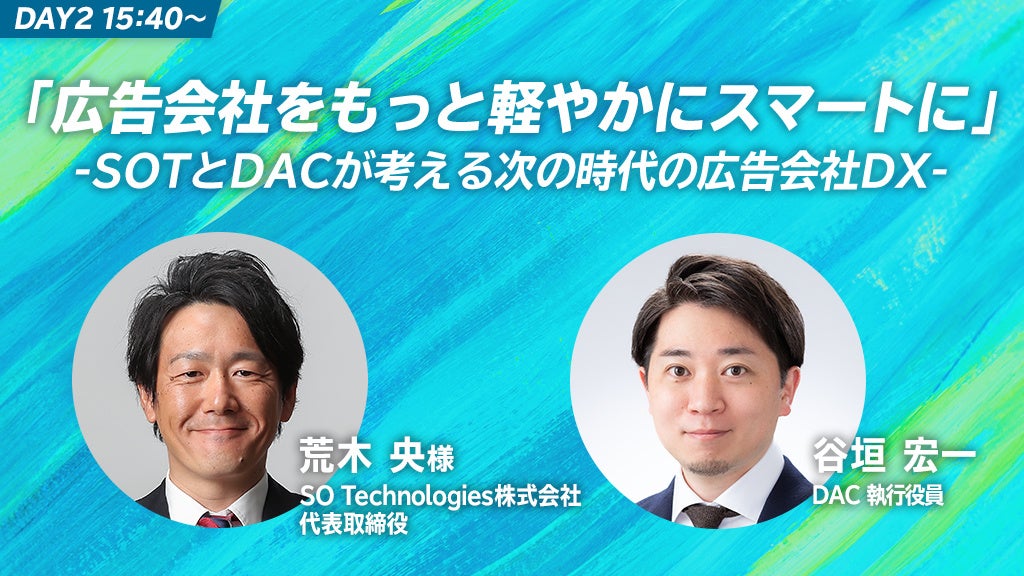 本セッションのテーマは「次の時代の広告会社DX」です。業務改善や人材開発で多くの広告会社を支援してきたSOTとDACによる対談形式で、事例やユースケースを踏まえた広告会社DXの勘所をお伝えします。