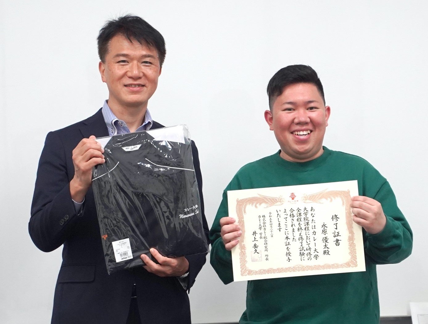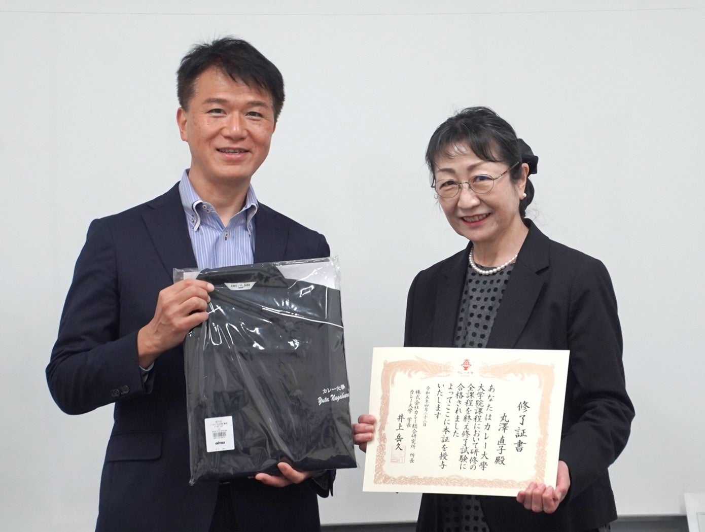 記念のコックコートを贈る井上学長と修了書を持って笑顔の須賀井さん
