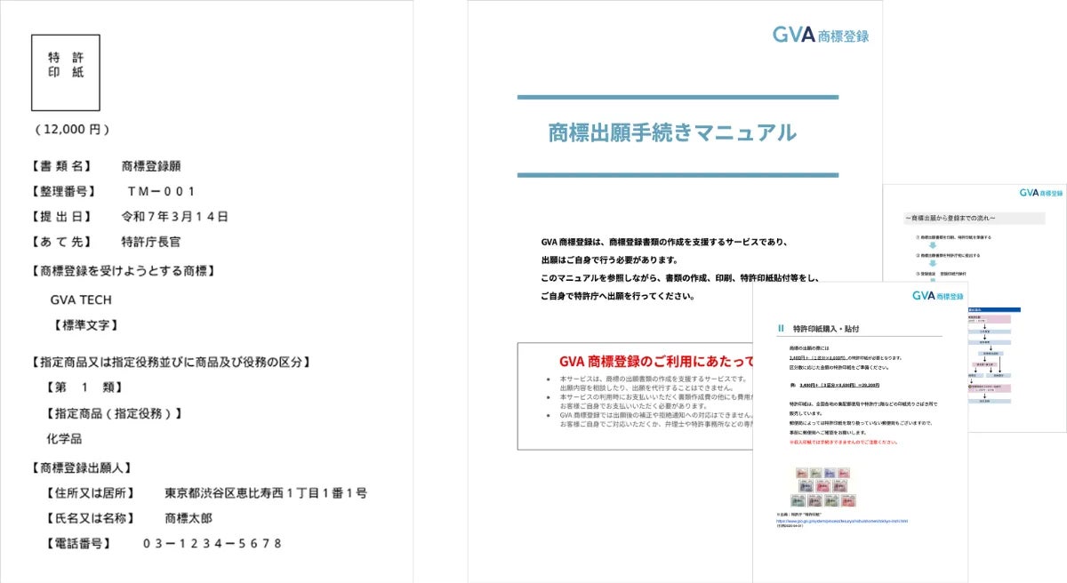 「GVA 商標登録」は、商標出願に必要な書類作成を支援するオンラインサービスで、ユーザー自身で出願手続きを進めることができます。