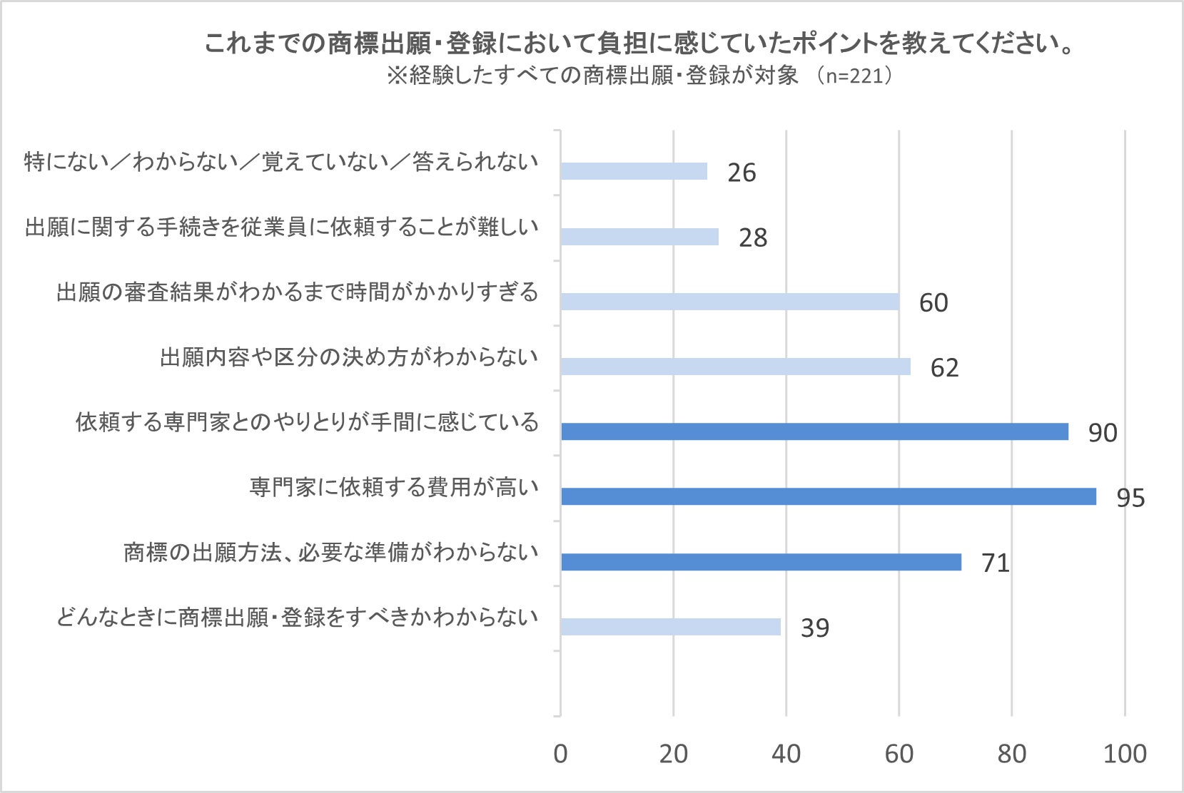 GVA TECHが独自に行ったアンケート調査においても、これまでの商標登録のプロセスにおいて負担に感じたポイントとして、「専門家に依頼する費用が高い」「専門家とのやり取りに手間がかかる」「商標の出願方法が分からない」といった点が高い割合で挙げられました。