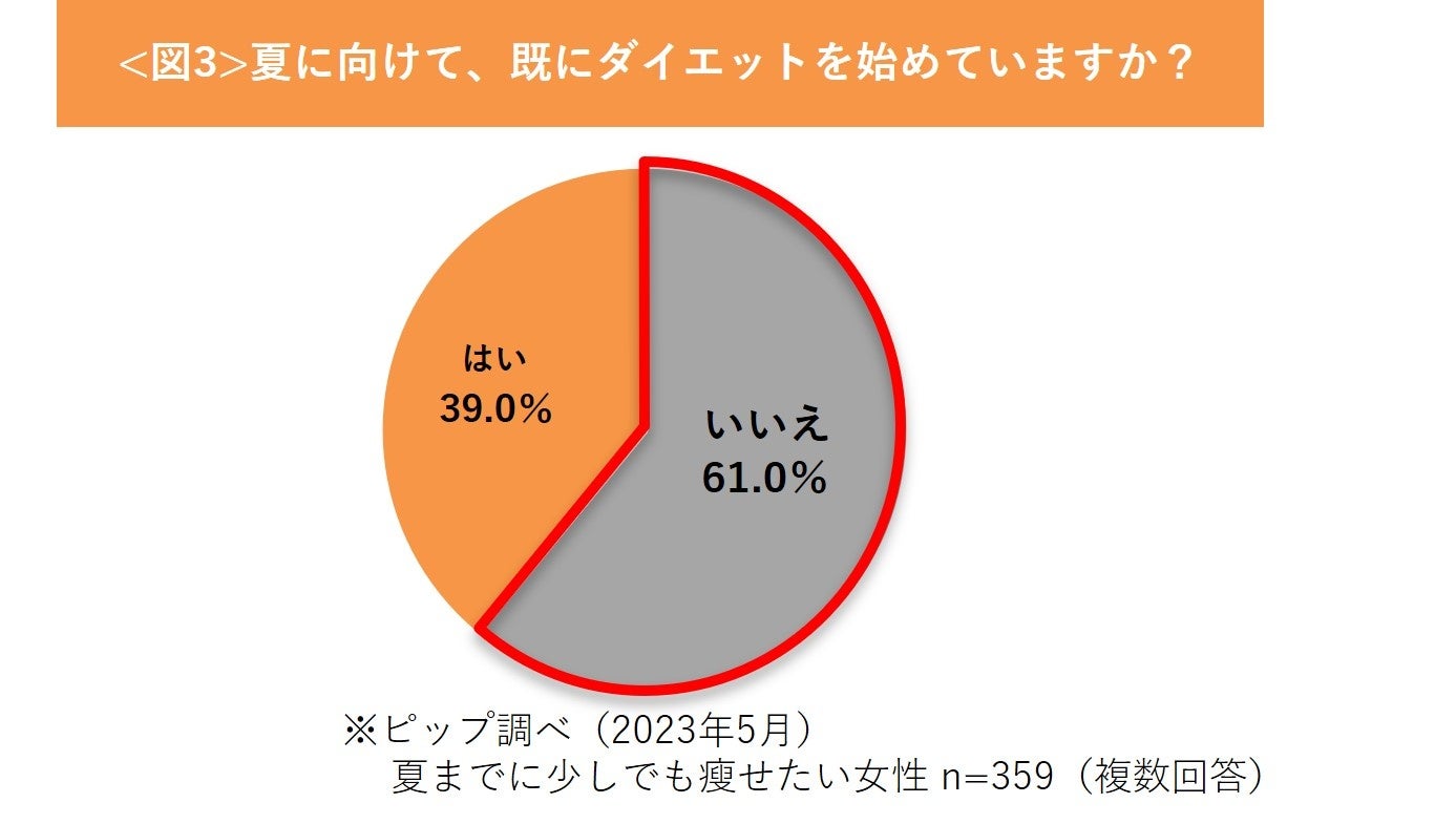 ピップが行った調査によると、20~40代の女性500名のうち、この夏行きたいところとして「花火大会(53.0%)」と回答した人が最も多く、次いで「お祭り(39.4%)」と回答した人が多い結果となりました<図1> 。新型コロナウイルスの感染症法上の位置づけが、2023年5月8日から季節性インフルエンザなどと同じ「5類」に移行し、脱コロナの動きが進んでいる今年こそは、夏ならではのアウトドアイベントに参加したいと考えている人が多いと予想されます。また夏に向けて少しでも瘦せたいと思っている人が71.8%もいることが判明しました<図2>。しかし瘦せたいと思っている女性のうち61.0%もの人が、まだダイエットを始められていないことも、今回の調査結果から明らかとなりました<図3> 。