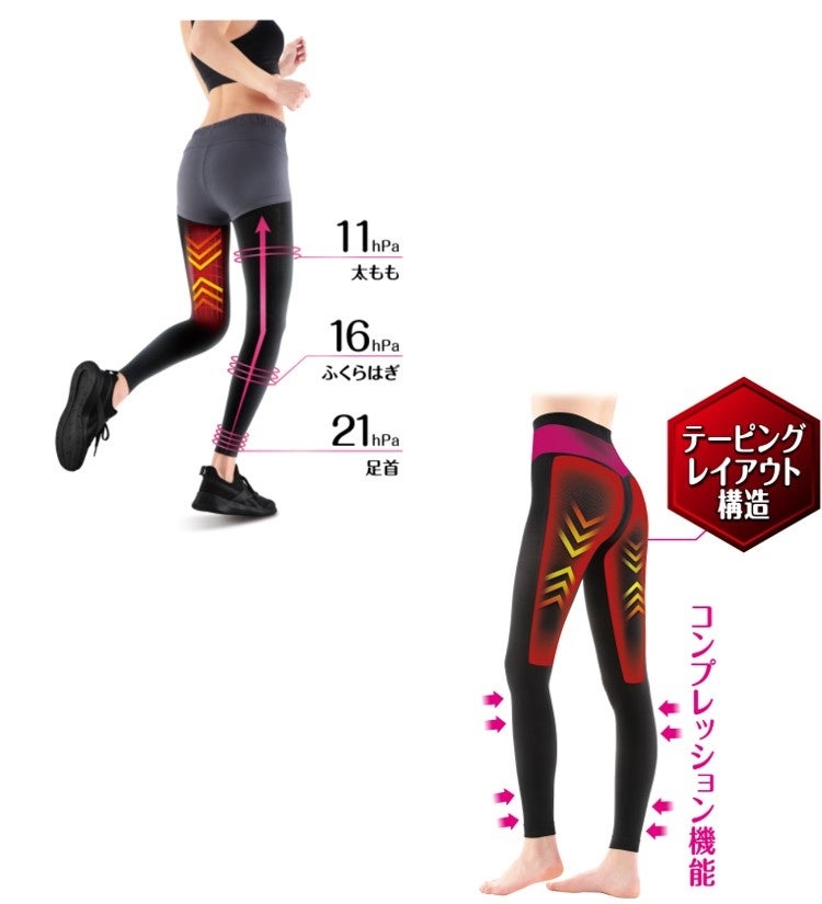 足首から上へいくほど圧力が低くなる設計(足首21hPa、ふくらはぎ16hPa、太もも11hP aで脚を軽やかに、スッキリと美しく整えます。