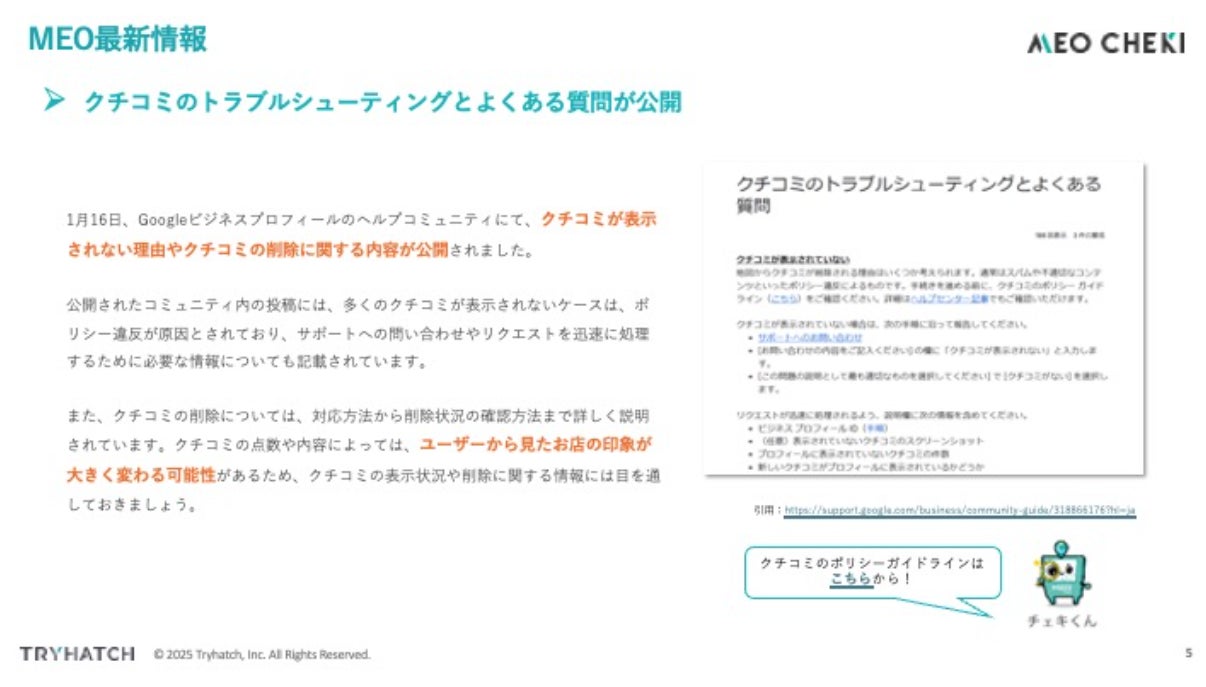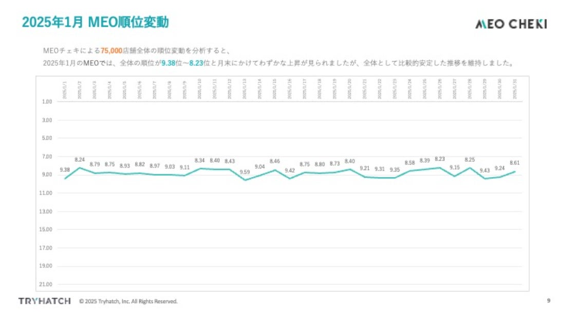 株式会社ベクトル(本社:東京都港区、代表取締役会長兼社長:西江 肇司、東証プライム:6058)の子会社である株式会社トライハッチ(東京都新宿区、代表取締役社長、武藤 尭行、以下「当社」)は、独自開発している店舗向けデジタルマーケティングツール「MEOチェキ」を活用して、MEOのアルゴリズム調査やトレンドをまとめた「MEOトレンドレポート」の2025年1月版を無料公開いたしました。