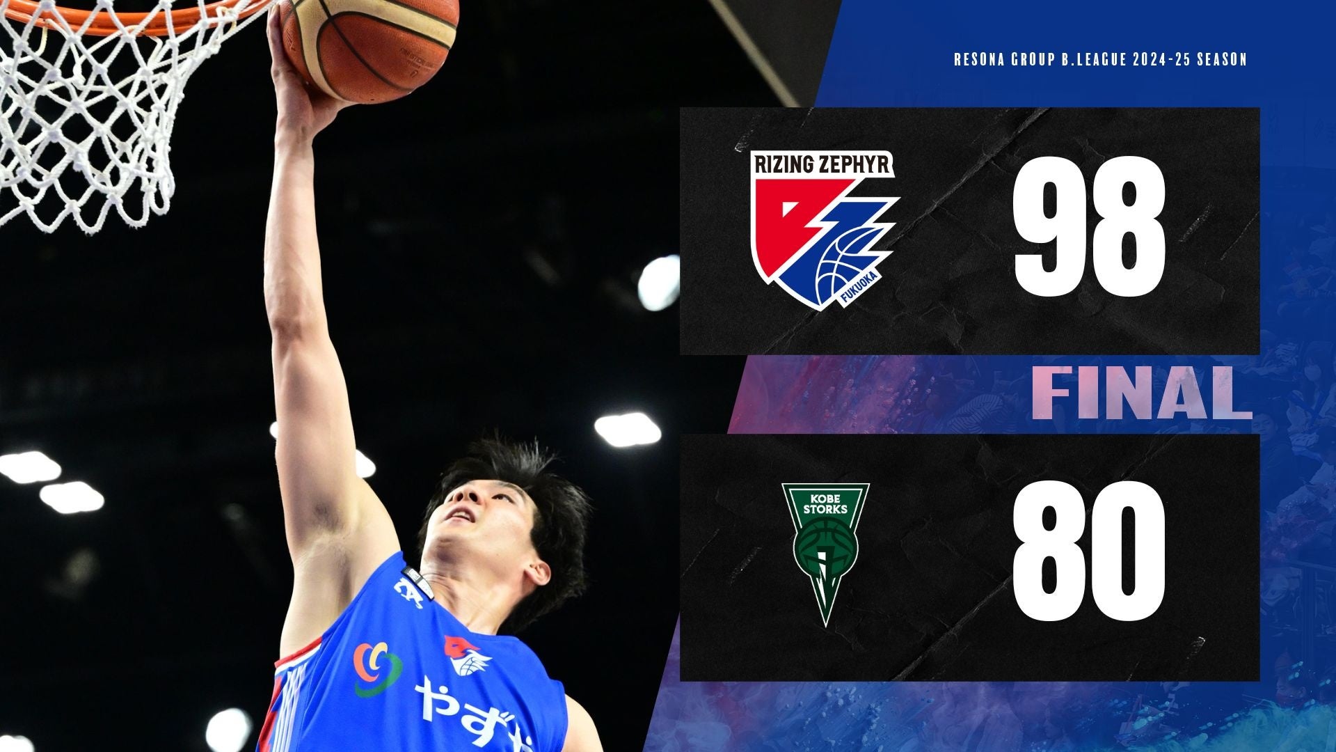 2024年11月2日(土)に開催した、りそなグループB.LEAGUE 2024-25シーズン【ライジングゼファーフクオカvs.神戸ストークス】において“福岡98-80神戸”の結果となりましたことをお知らせいたします。