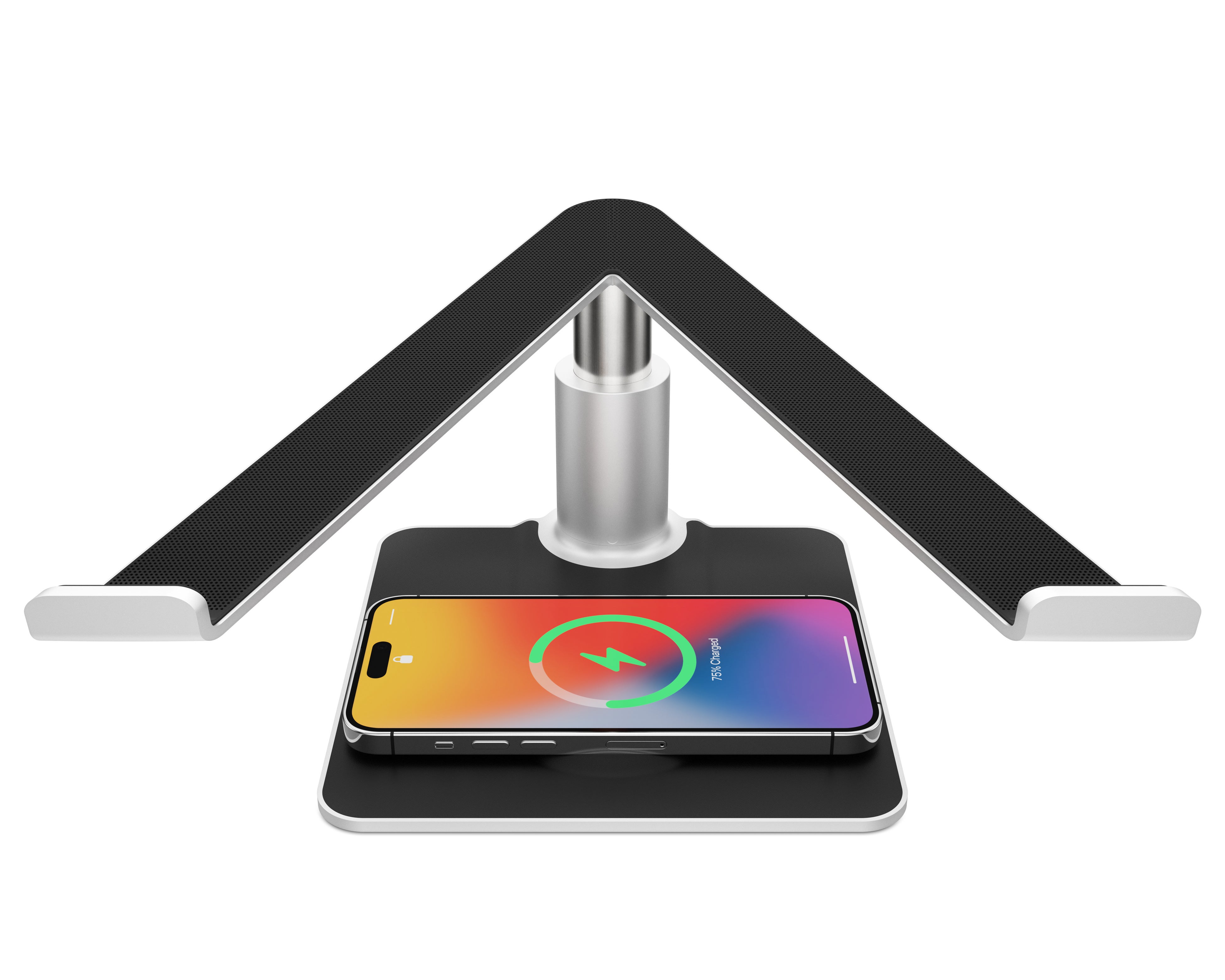HiRise Proのベースの裏にはMagSafe充電器を設置できるスペースが設けられています。ヴィーガンレザー張りのベースの上にお使いのiPhoneやAirPodsを置けばワイヤレス充電が可能です。もちろん、MagSafe充電器は必要に応じていつでも取り外せます。