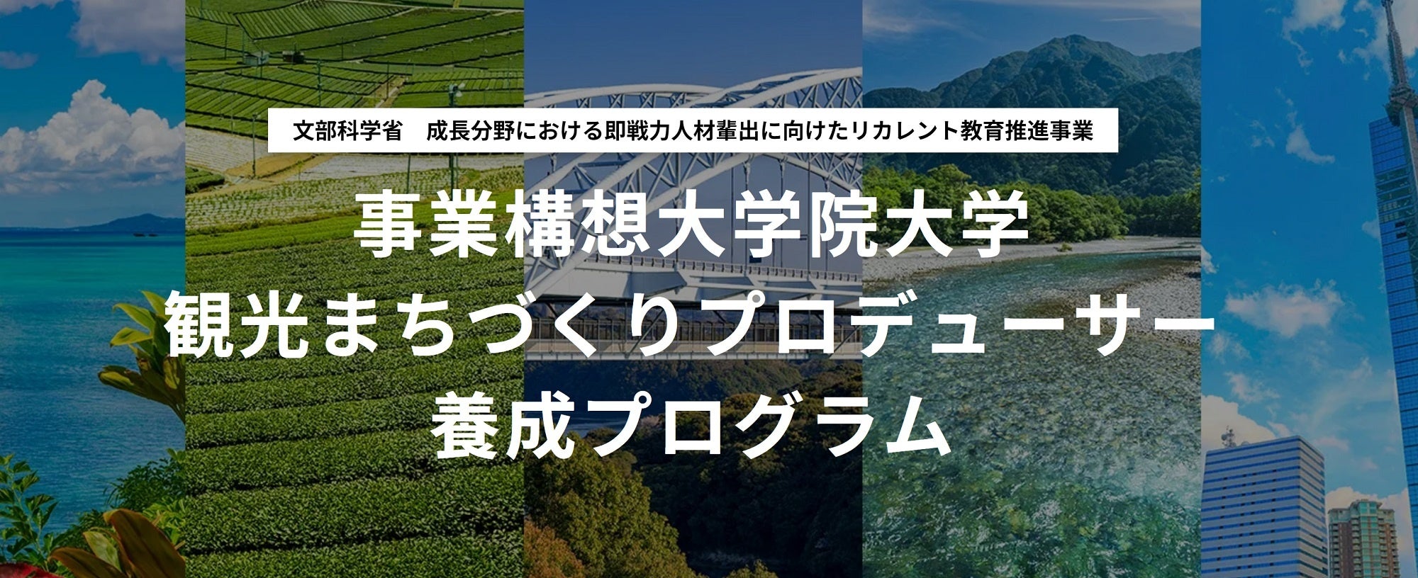 「観光まちづくりプロデューサー養成プログラム」では、文部科学省の助成を得て、事業構想大学院大学の専門的な指導と実践的な地域フィールドワークを有効に掛け合わせたカリキュラムを実施し、持続可能な「稼げる観光まちづくり」を目指すプロデューサー人材を養成します。