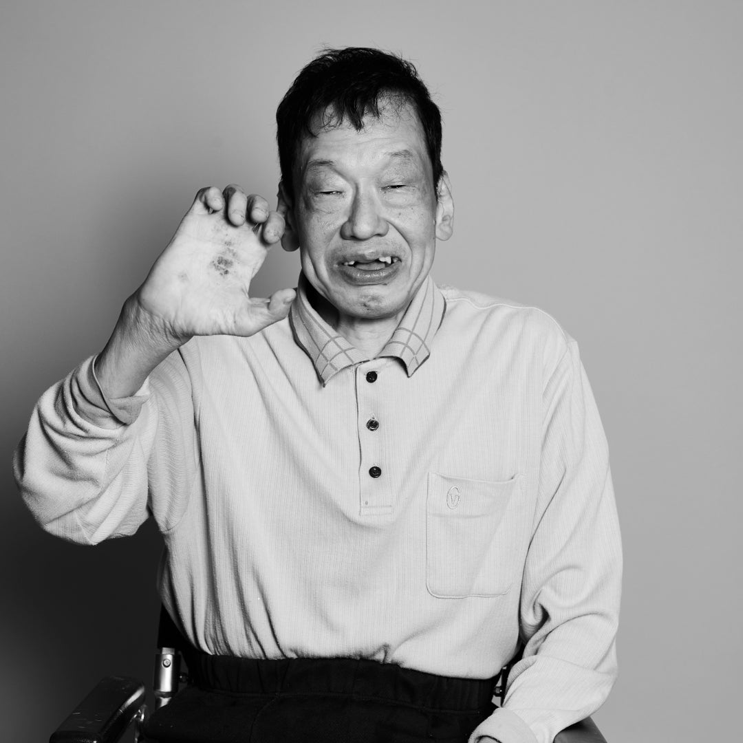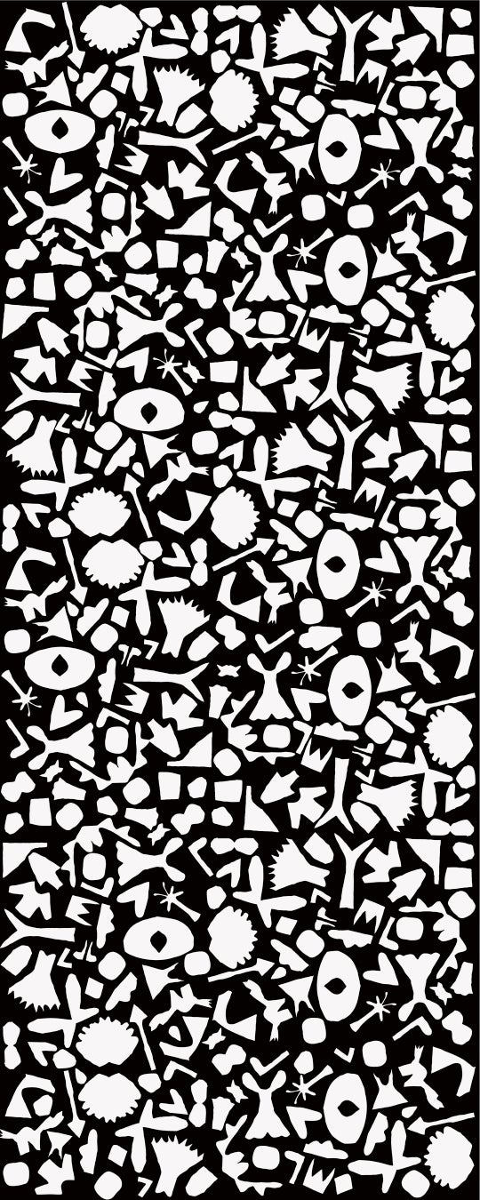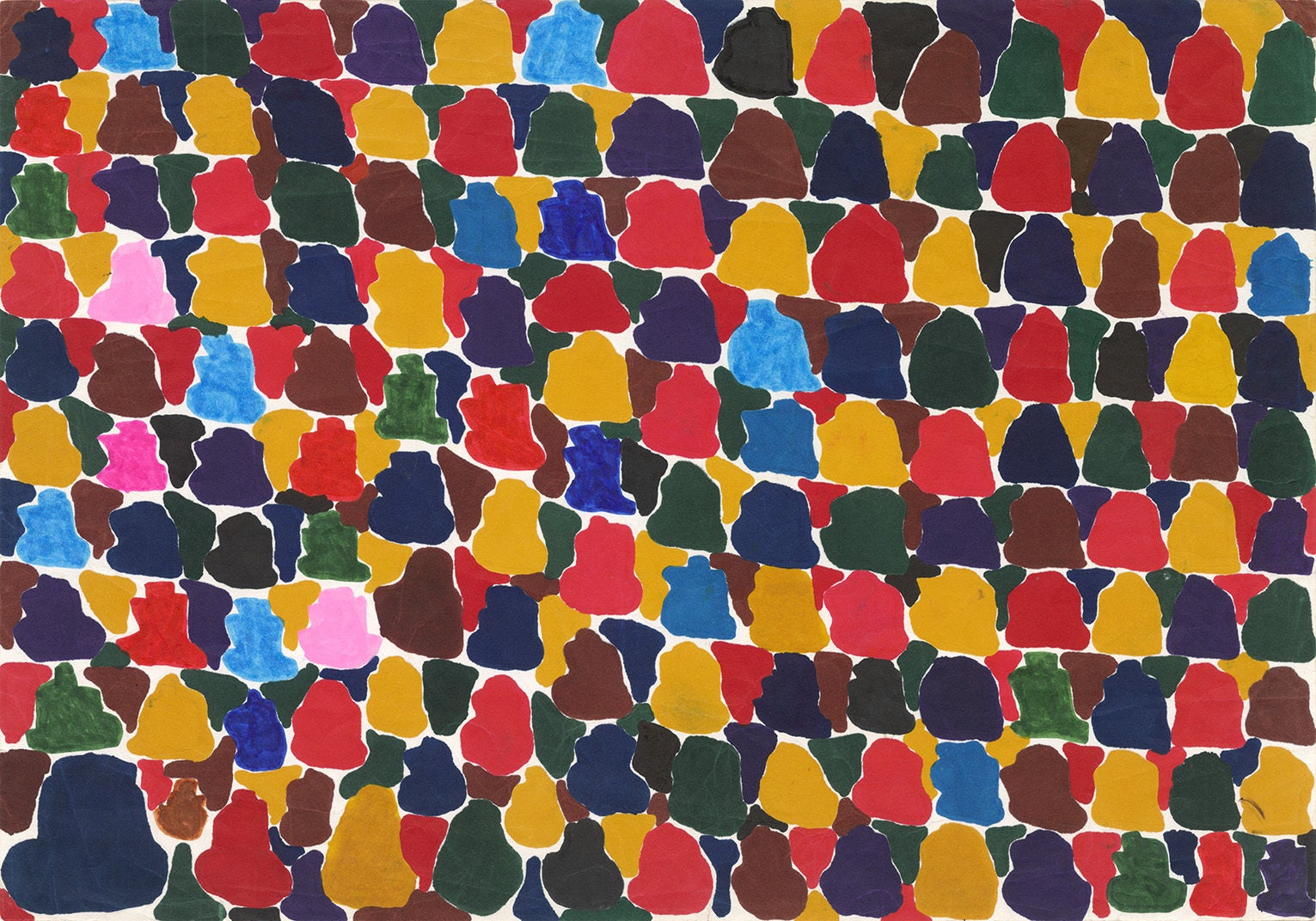 彼の文字への執着は幼少の頃から続いている。自室で密かに制作していた作品が紹介されると、たちまち国内外から注目を集める。画用紙を最後まで埋め尽くした作品は数枚しかなく、大半は途中でとまっていて、なぜか縦方向に描き進んでいる。作品の評価や世間の注目とは無縁に、10年ほど前から漢字ではなく、色とりどりのベルや星、そして近年は小さなドットを描くことに熱中している。まるで染め物のように裏面に滲み出るまで執拗に塗り込み、その行為自体を楽しんでいるかのよう。執念的と言える彼のこだわりと手法に思わず感嘆する。