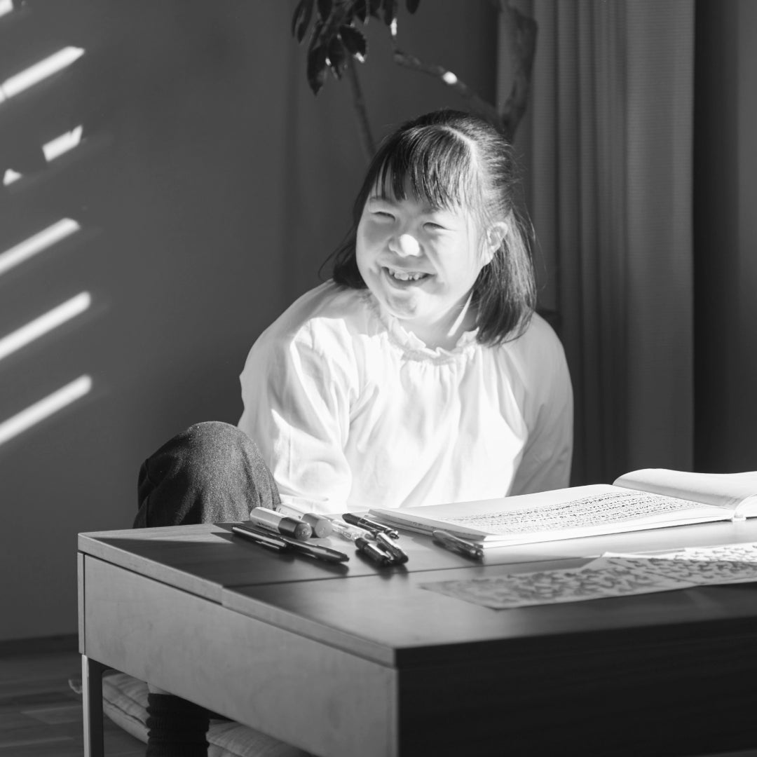 学校に行けず暇を持て余していた時期に、作家の母が「マルを描いて」と紙とペンを渡したのが創作のはじまり。マルというモチーフが彼女のなかでピタリとはまり熱中するようになる。マルを描き始めて5年になるが、近年はマル以外のモチーフも描くようになり、マル、サンカク、シカクのモチーフを大きなカンバスに日々飽きることなく描き続ける。コミュニケーションとして発する言葉はわずかだが、頭に浮かんだであろう言葉を繰り返し呟き、言葉と一緒に作品が生まれることもある。