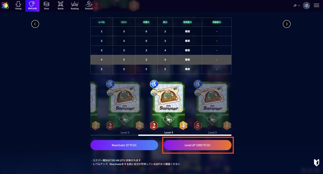 ②レベルアップしたいカードを選んで「Level UP」をクリック